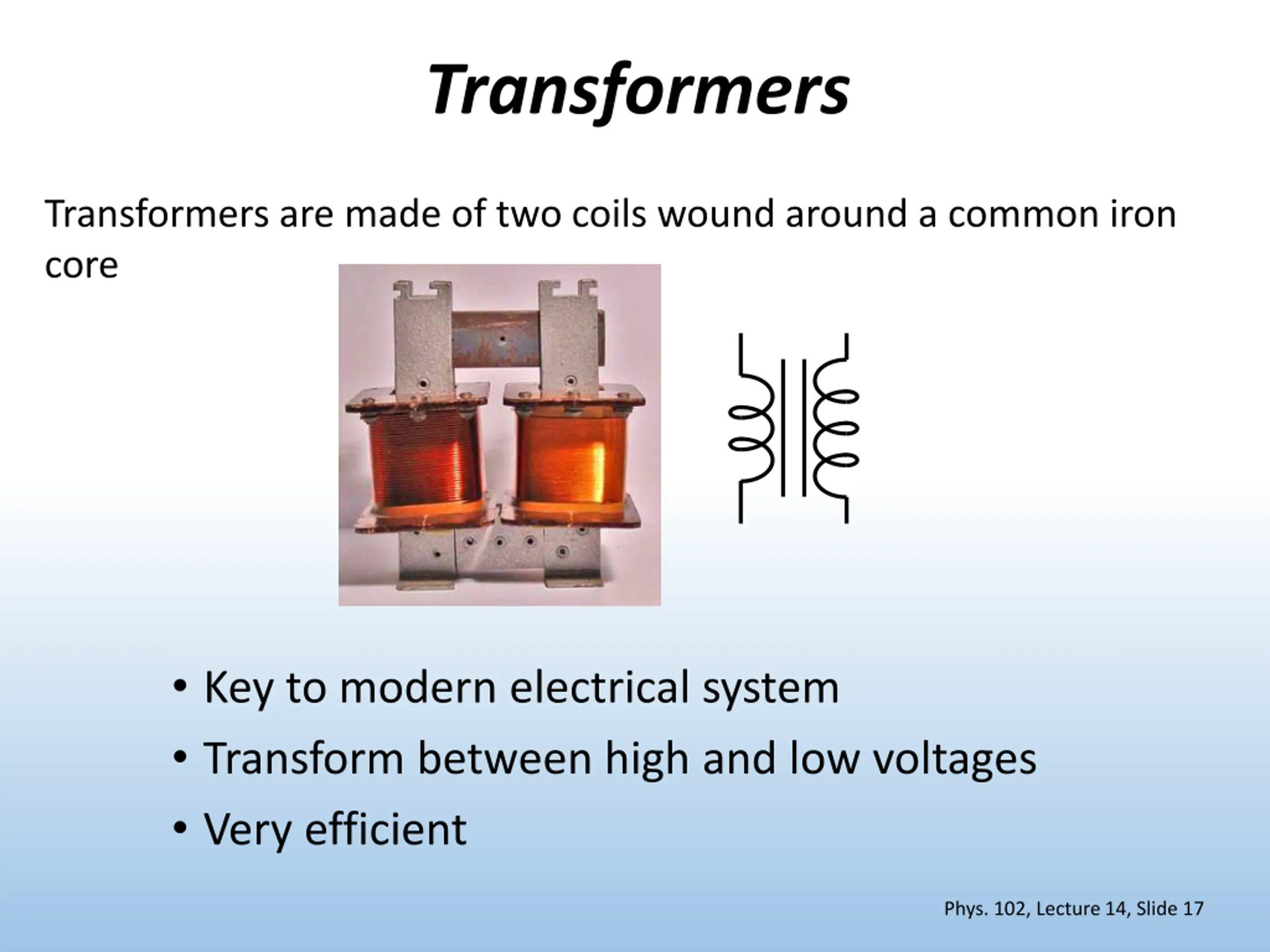 Transformers Transformers are made of two coils wound around a common iron core Key to modern electrical system Transform between high and low voltages Very efficient Phys. 102, Lecture 14, Slide 17