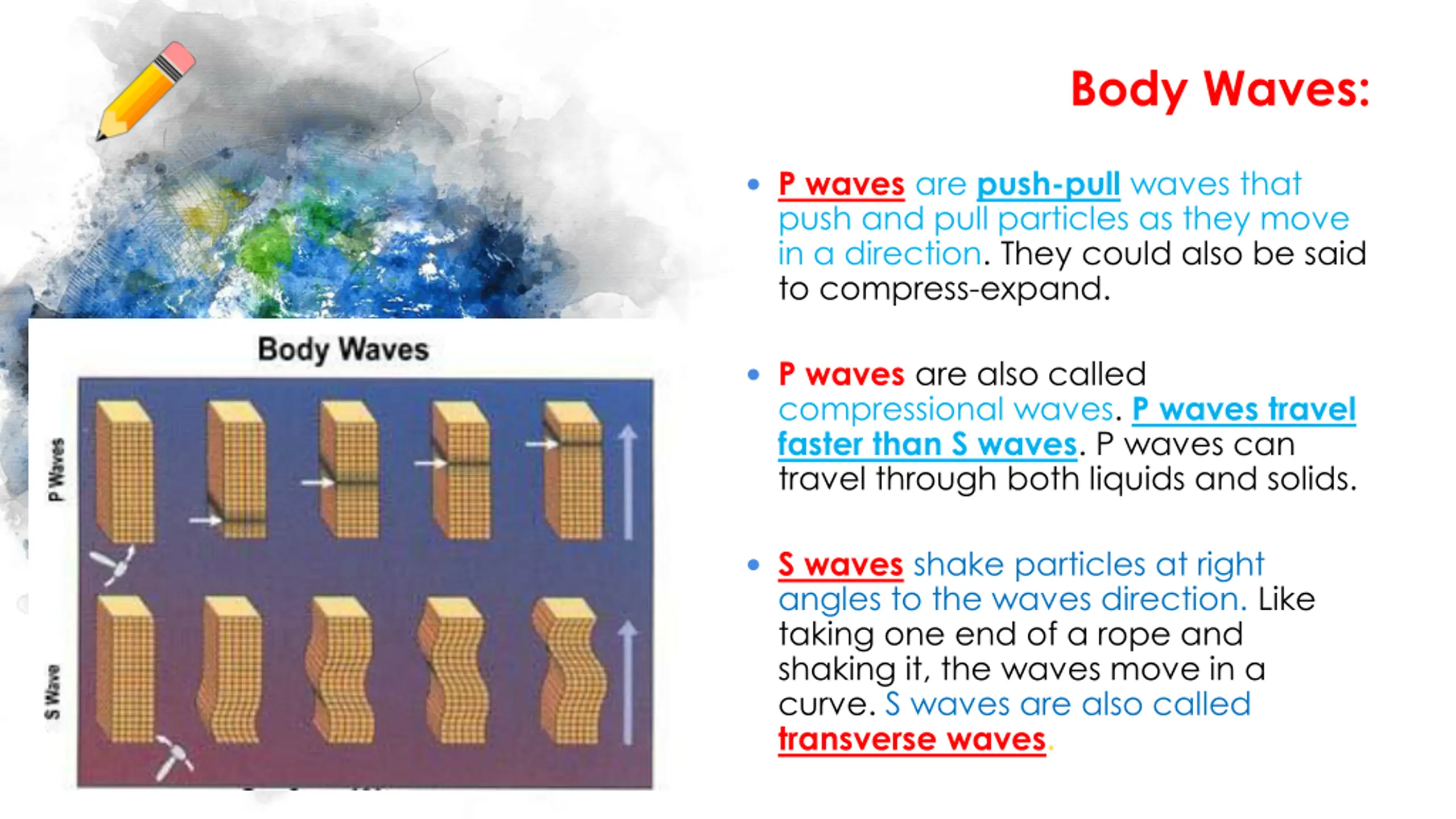 Body Waves: P waves are push-pull waves that push and pull particles as they move in a direction. They could also be said to compress-expand. P waves are also called compressional waves. P waves travel faster than S waves. P waves can travel through both liquids and solids. S waves shake particles at right angles to the waves direction. Like taking one end of a rope and shaking it, the waves move in a curve. S waves are also called transverse waves.