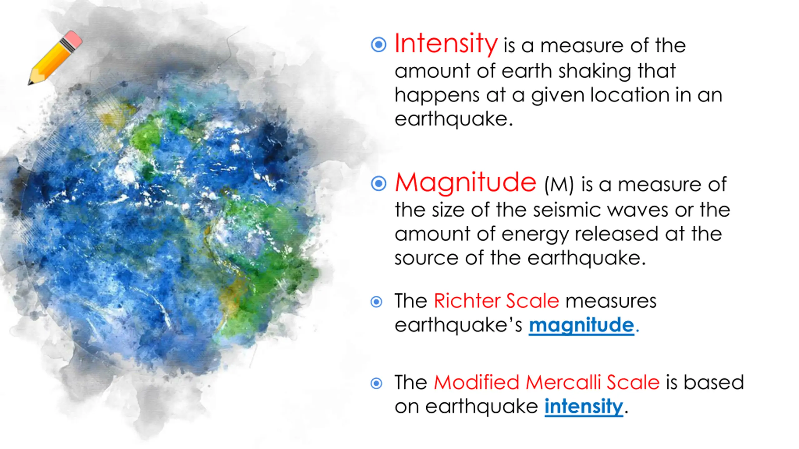 Intensity is a measure of the amount of earth shaking that happens at a given location in an earthquake. Magnitude (M) is a measure of the size of the seismic waves or the amount of energy released at the source of the earthquake. The Richter Scale measures earthquake s magnitude. The Modified Mercalli Scale is based on earthquake intensity.