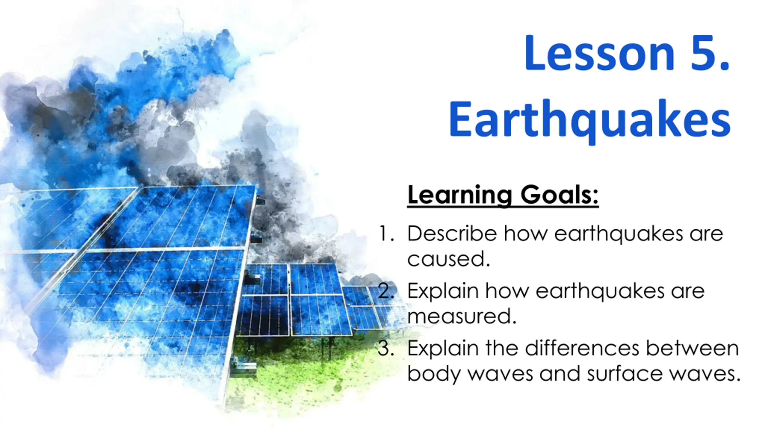 Lesson 5. Earthquakes Learning Goals: 1. Describe how earthquakes are caused. 2. Explain how earthquakes are measured. 3. Explain the differences between body waves and surface waves.