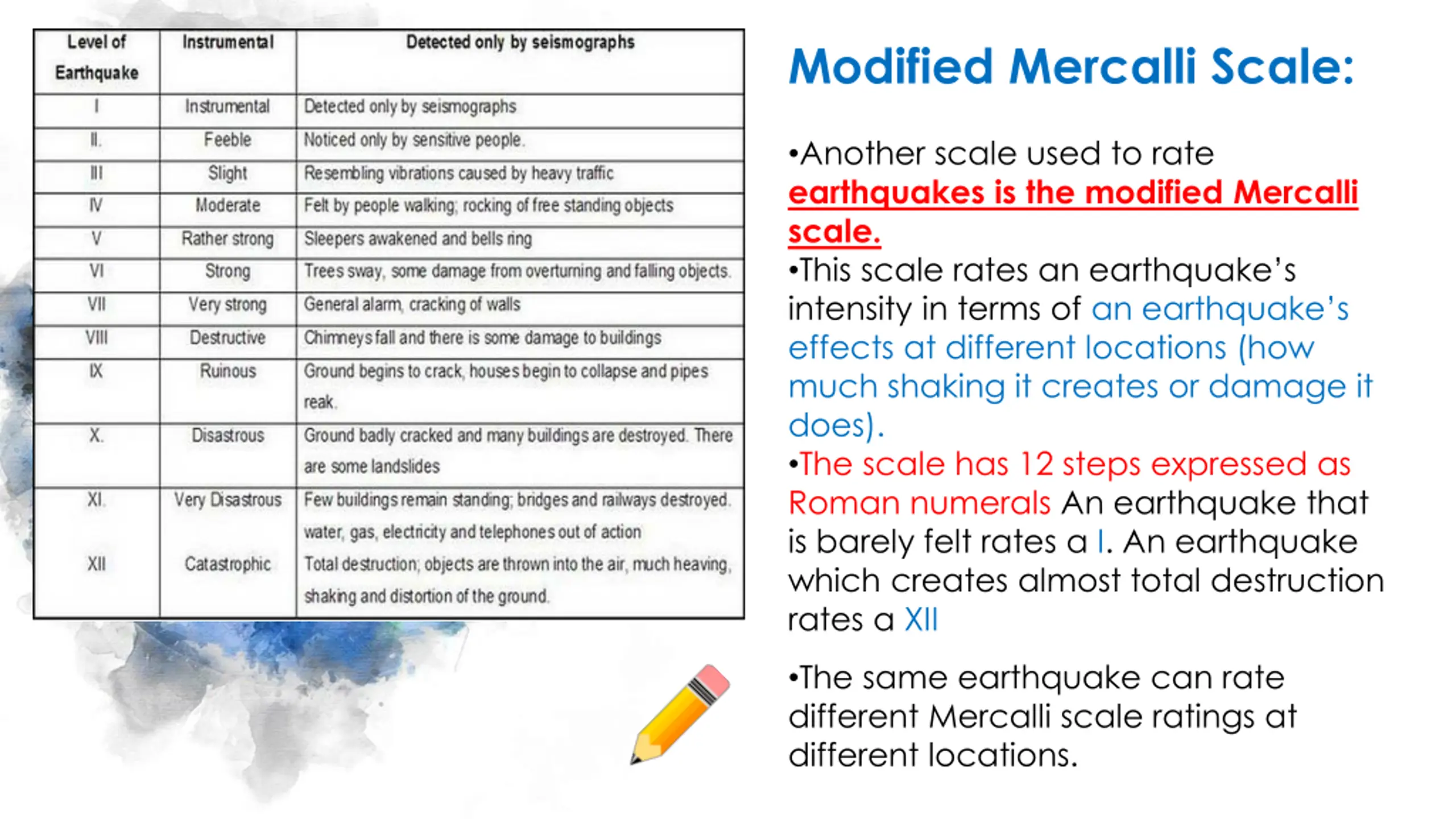 Modified Mercalli Scale: Another scale used to rate earthquakes is the modified Mercalli scale. This scale rates an earthquake s intensity in terms of an earthquake s effects at different locations (how much shaking it creates or damage it does). The scale has 12 steps expressed as Roman numerals An earthquake that is barely felt rates a I. An earthquake which creates almost total destruction rates a XII The same earthquake can rate different Mercalli scale ratings at different locations.