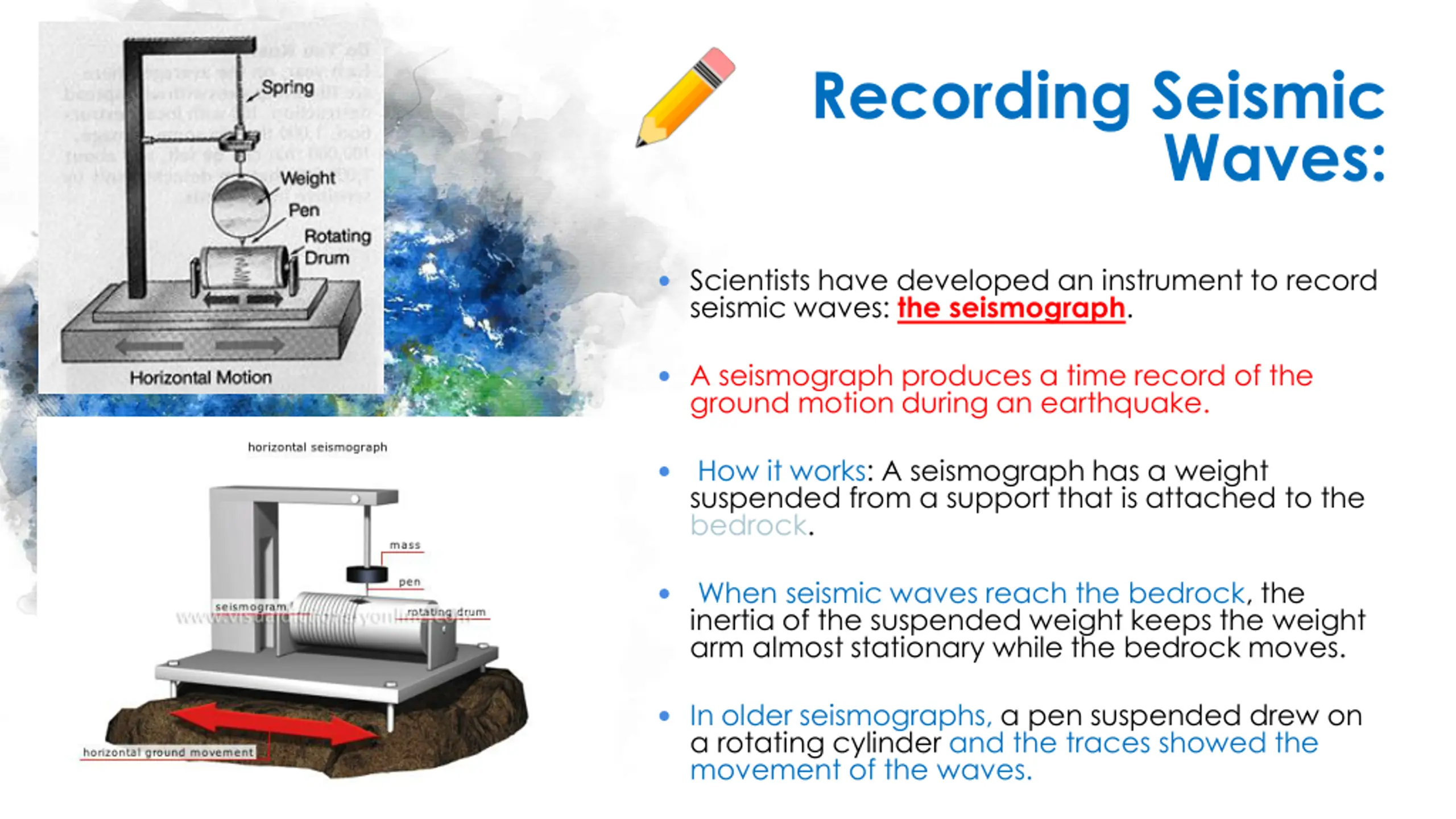Recording Seismic Waves: Scientists have developed an instrument to record seismic waves: the seismograph. A seismograph produces a time record of the ground motion during an earthquake. How it works: A seismograph has a weight suspended from a support that is attached to the bedrock. When seismic waves reach the bedrock, the inertia of the suspended weight keeps the weight arm almost stationary while the bedrock moves. In older seismographs, a pen suspended drew on a rotating cylinder and the traces showed the movement of the waves.