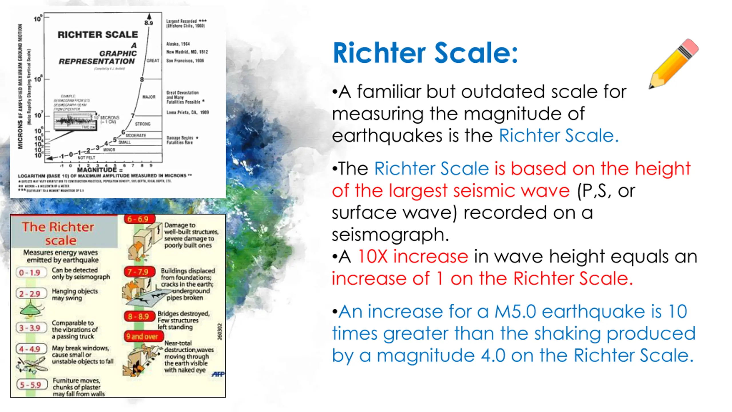 Richter Scale: A familiar but outdated scale for measuring the magnitude of earthquakes is the Richter Scale. The Richter Scale is based on the height of the largest seismic wave (P,S, or surface wave) recorded on a seismograph. A 10X increase in wave height equals an increase of 1 on the Richter Scale. An increase for a M5.0 earthquake is 10 times greater than the shaking produced by a magnitude 4.0 on the Richter Scale.
