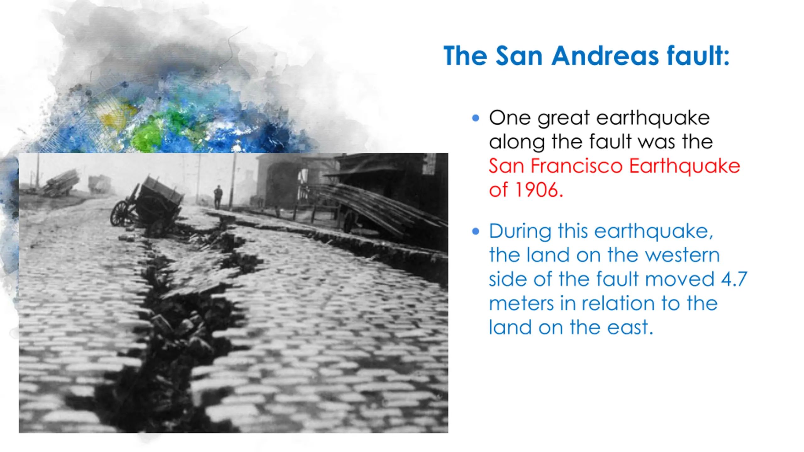 The San Andreas fault: One great earthquake along the fault was the San Francisco Earthquake of 1906. During this earthquake, the land on the western side of the fault moved 4.7 meters in relation to the land on the east.