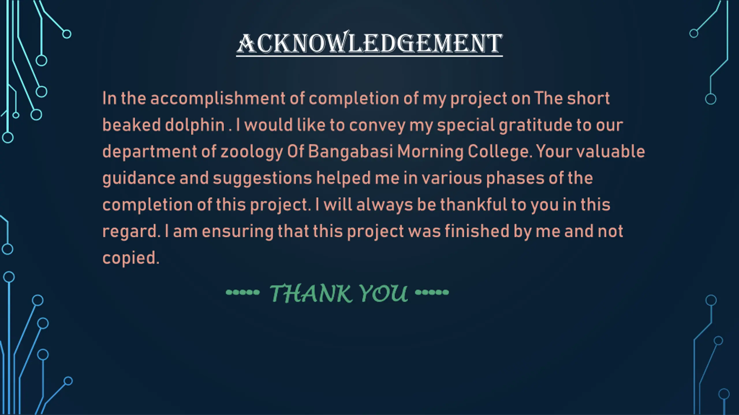 ACKNOWLEDGEMENT In the accomplishment of completion of my project on The short beaked dolphin . I would like to convey my special gratitude to our department of zoology Of Bangabasi Morning College. Your valuable guidance and suggestions helped me in various phases of the completion of this project. I will always be thankful to you in this regard. I am ensuring that this project was finished by me and not copied. THANK YOU THANK YOU