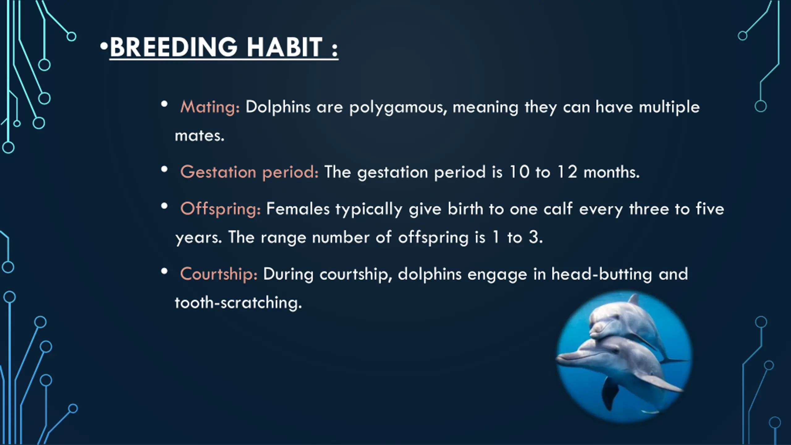 BREEDING HABIT : Mating: Dolphins are polygamous, meaning they can have multiple mates. Gestation period: The gestation period is 10 to 12 months. Offspring: Females typically give birth to one calf every three to five years. The range number of offspring is 1 to 3. Courtship: During courtship, dolphins engage in head-butting and tooth-scratching.