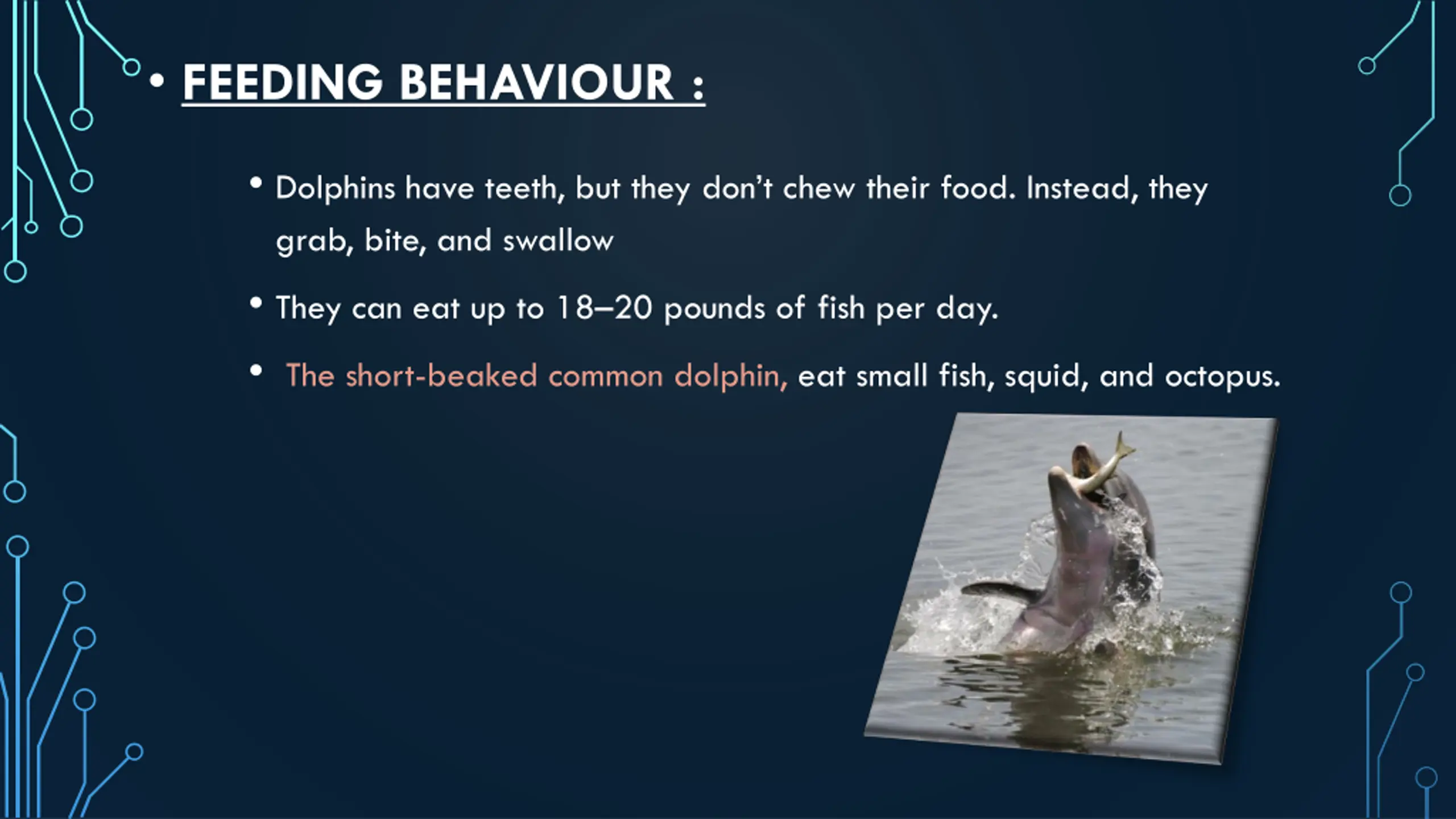 FEEDING BEHAVIOUR : Dolphins have teeth, but they don t chew their food. Instead, they grab, bite, and swallow They can eat up to 18 20 pounds of fish per day. The short-beaked common dolphin, eat small fish, squid, and octopus.