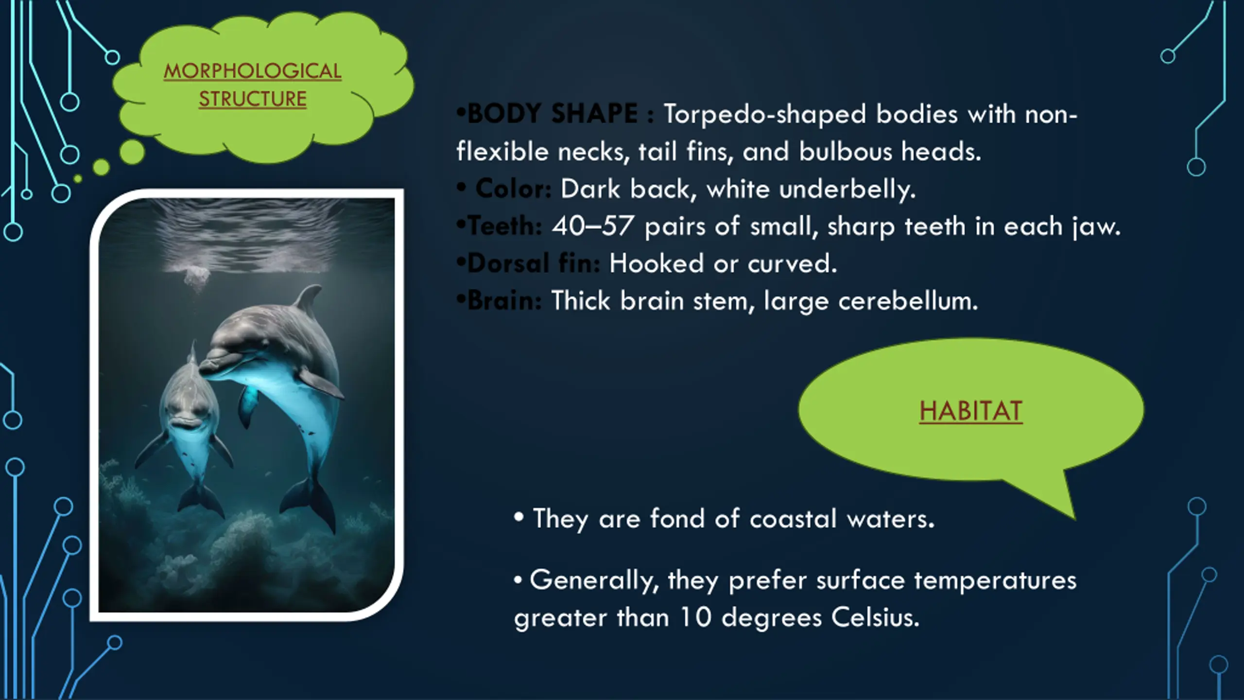 MORPHOLOGICAL STRUCTURE BODY SHAPE : Torpedo-shaped bodies with non- flexible necks, tail fins, and bulbous heads. Color: Dark back, white underbelly. Teeth: 40 57 pairs of small, sharp teeth in each jaw. Dorsal fin: Hooked or curved. Brain: Thick brain stem, large cerebellum. HABITAT They are fond of coastal waters. Generally, they prefer surface temperatures greater than 10 degrees Celsius.