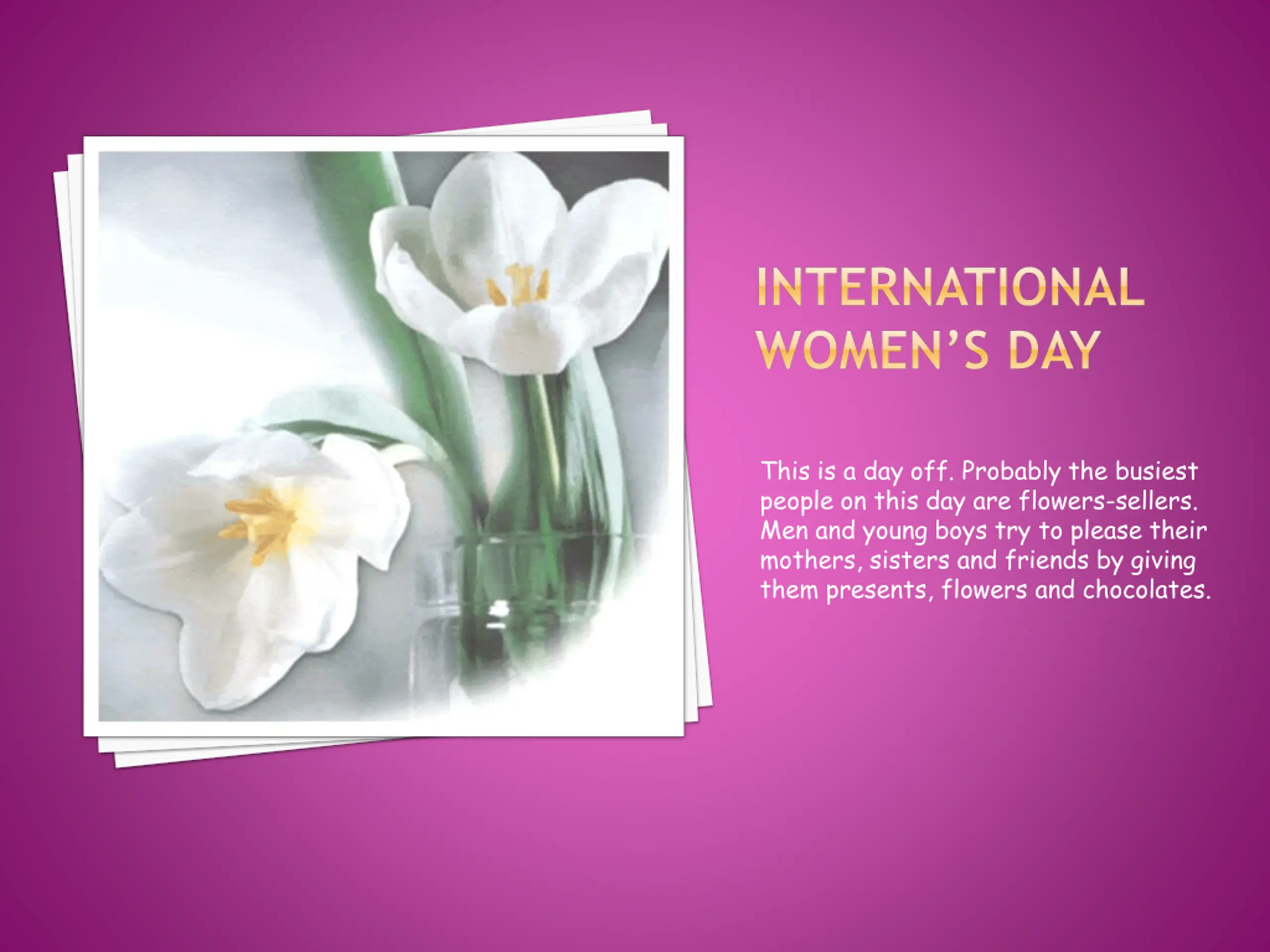 INTERNATIONAL WOMEN S DAY This is a day off. Probably the busiest people on this day are flowers-sellers. Men and young boys try to please their mothers, sisters and friends by giving them presents, flowers and chocolates.