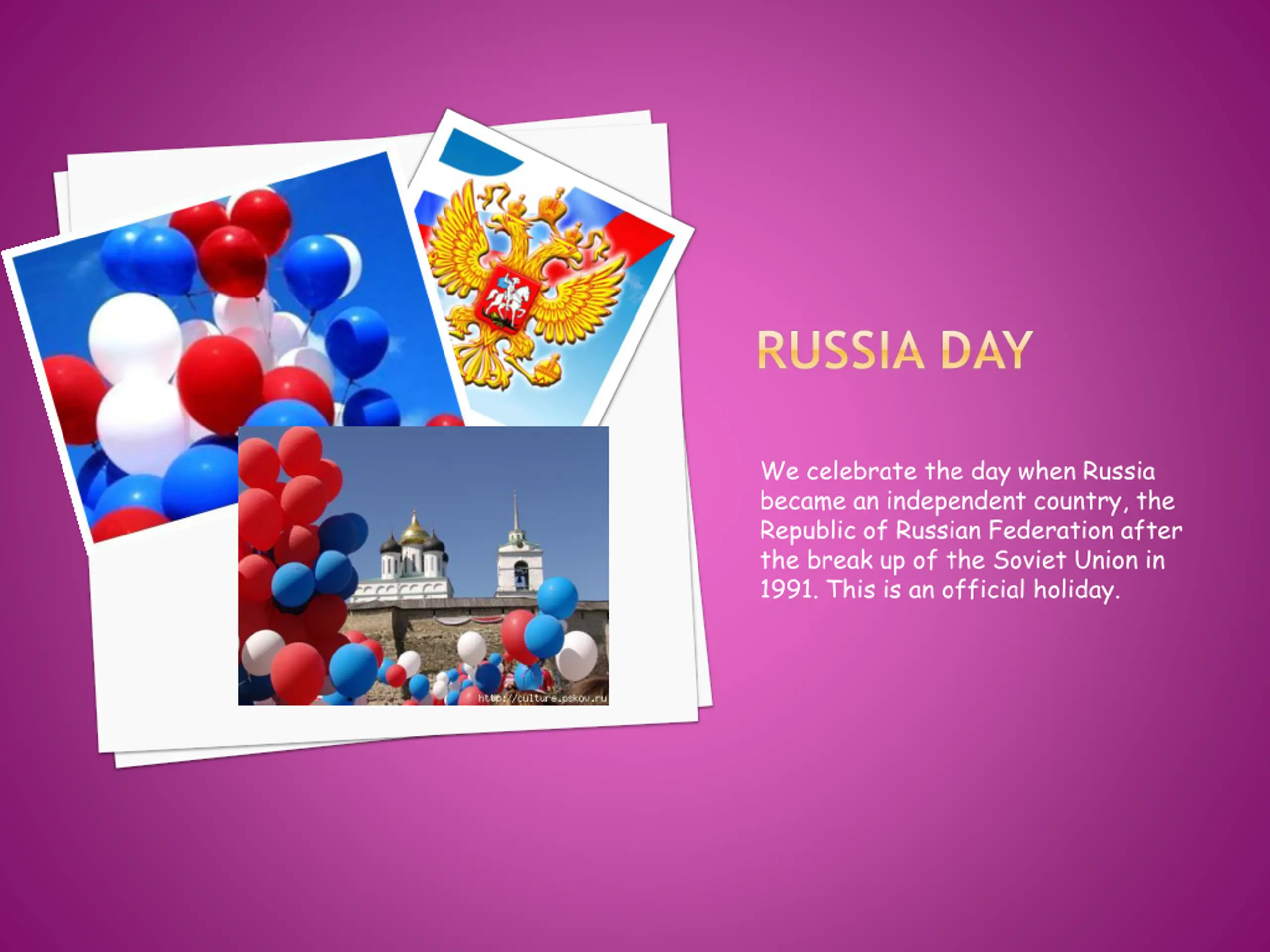 RUSSIA DAY We celebrate the day when Russia became an independent country, the Republic of Russian Federation after the break up of the Soviet Union in 1991. This is an official holiday.