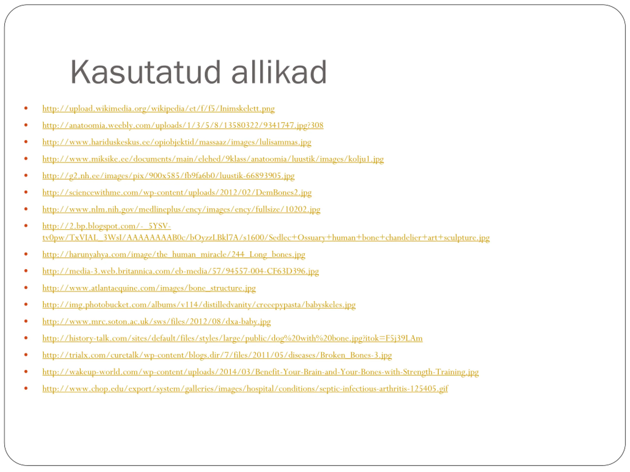 Kasutatud allikad http://upload.wikimedia.org/wikipedia/et/f/f5/Inimskelett.png http://anatoomia.weebly.com/uploads/1/3/5/8/13580322/9341747.jpg?308 http://www.hariduskeskus.ee/opiobjektid/massaaz/images/lulisammas.jpg http://www.miksike.ee/documents/main/elehed/9klass/anatoomia/luustik/images/kolju1.jpg http://g2.nh.ee/images/pix/900x585/fb9fa6b0/luustik-66893905.jpg http://sciencewithme.com/wp-content/uploads/2012/02/DemBones2.jpg http://www.nlm.nih.gov/medlineplus/ency/images/ency/fullsize/10202.jpg http://2.bp.blogspot.com/-_5YSV- tv0pw/TxVIAL_3WsI/AAAAAAAAB0c/bOyzzLBkl7A/s1600/Sedlec+Ossuary+human+bone+chandelier+art+sculpture.jpg http://harunyahya.com/image/the_human_miracle/244_Long_bones.jpg http://media-3.web.britannica.com/eb-media/57/94557-004-CF63D396.jpg http://www.atlantaequine.com/images/bone_structure.jpg http://img.photobucket.com/albums/v114/distilledvanity/creeepypasta/babyskeles.jpg http://www.mrc.soton.ac.uk/sws/files/2012/08/dxa-baby.jpg http://history-talk.com/sites/default/files/styles/large/public/dog%20with%20bone.jpg?itok=F5j39LAm http://trialx.com/curetalk/wp-content/blogs.dir/7/files/2011/05/diseases/Broken_Bones-3.jpg http://wakeup-world.com/wp-content/uploads/2014/03/Benefit-Your-Brain-and-Your-Bones-with-Strength-Training.jpg http://www.chop.edu/export/system/galleries/images/hospital/conditions/septic-infectious-arthritis-125405.gif