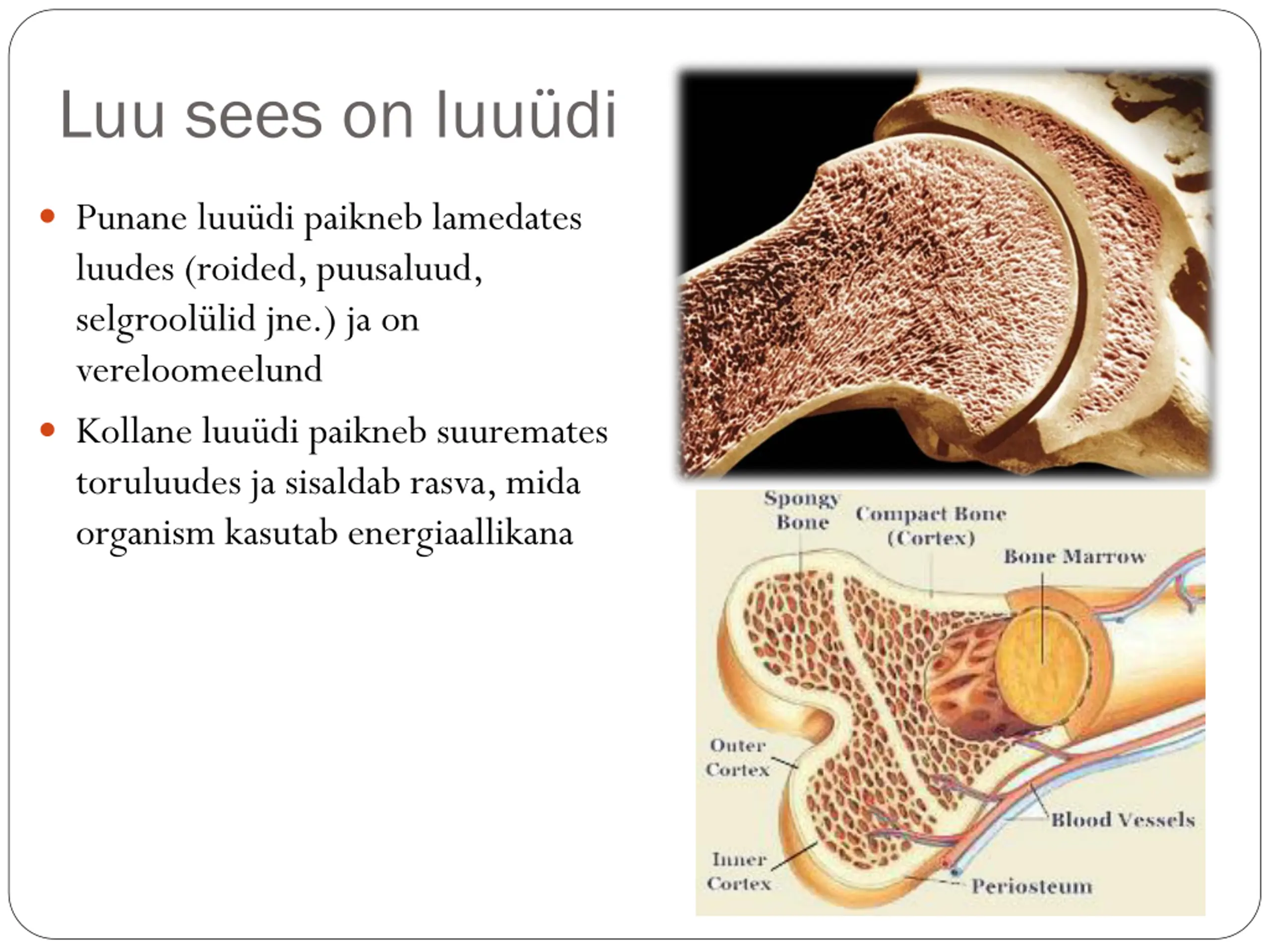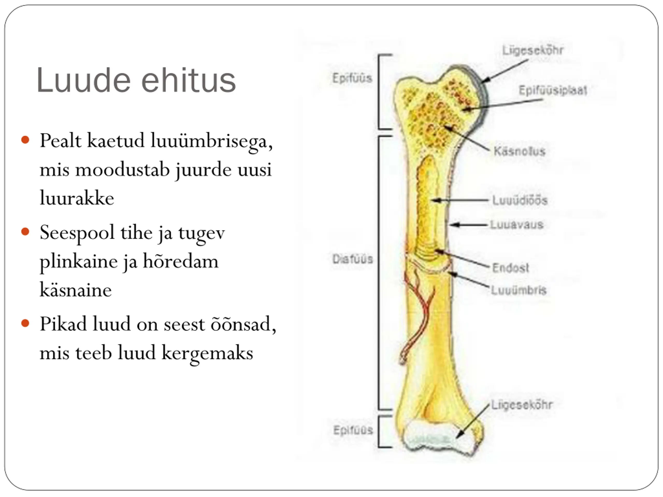 Luude ehitus Pealt kaetud luu mbrisega, mis moodustab juurde uusi luurakke Seespool tihe ja tugev plinkaine ja h redam k snaine Pikad luud on seest nsad, mis teeb luud kergemaks