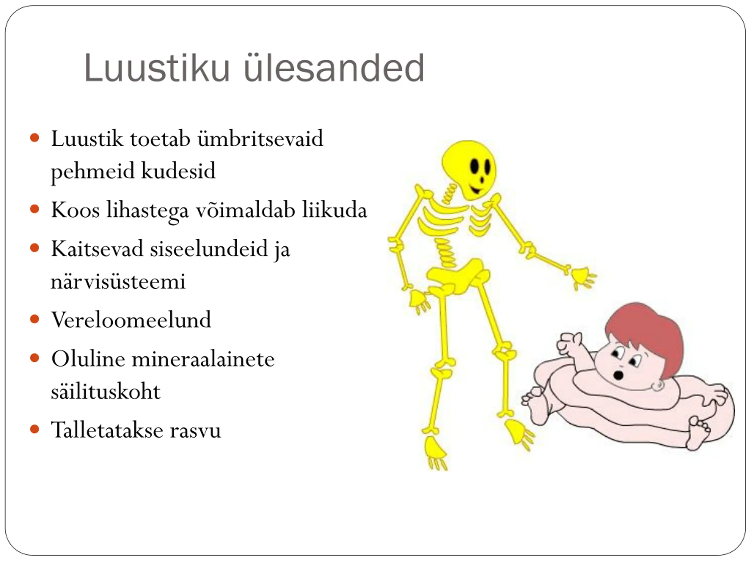 Luustiku lesanded Luustik toetab mbritsevaid pehmeid kudesid Koos lihastega v imaldab liikuda Kaitsevad siseelundeid ja n rvis steemi Vereloomeelund Oluline mineraalainete s ilituskoht Talletatakse rasvu