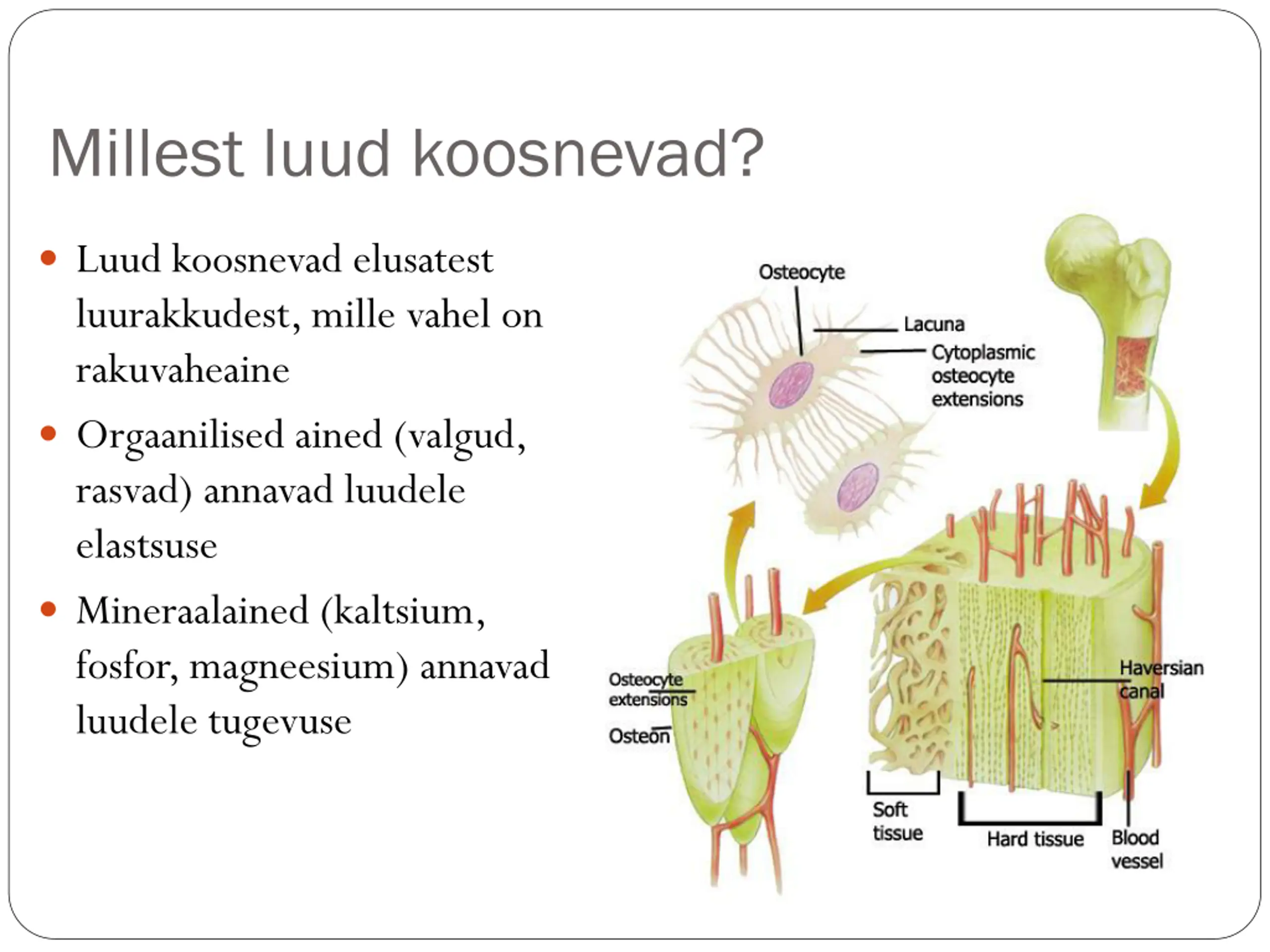 Millest luud koosnevad? Luud koosnevad elusatest luurakkudest, mille vahel on rakuvaheaine Orgaanilised ained (valgud, rasvad) annavad luudele elastsuse Mineraalained (kaltsium, fosfor, magneesium) annavad luudele tugevuse