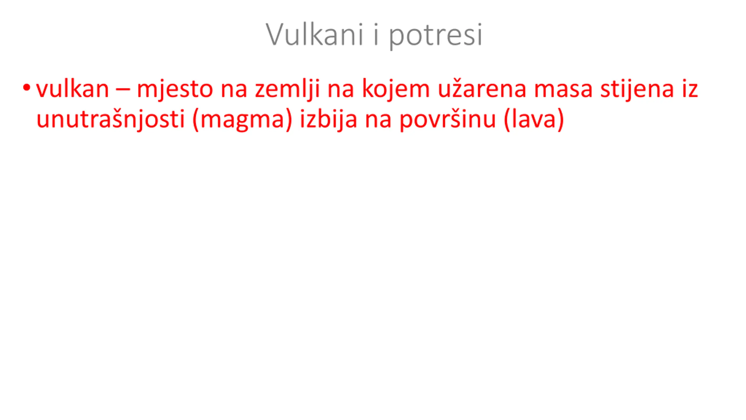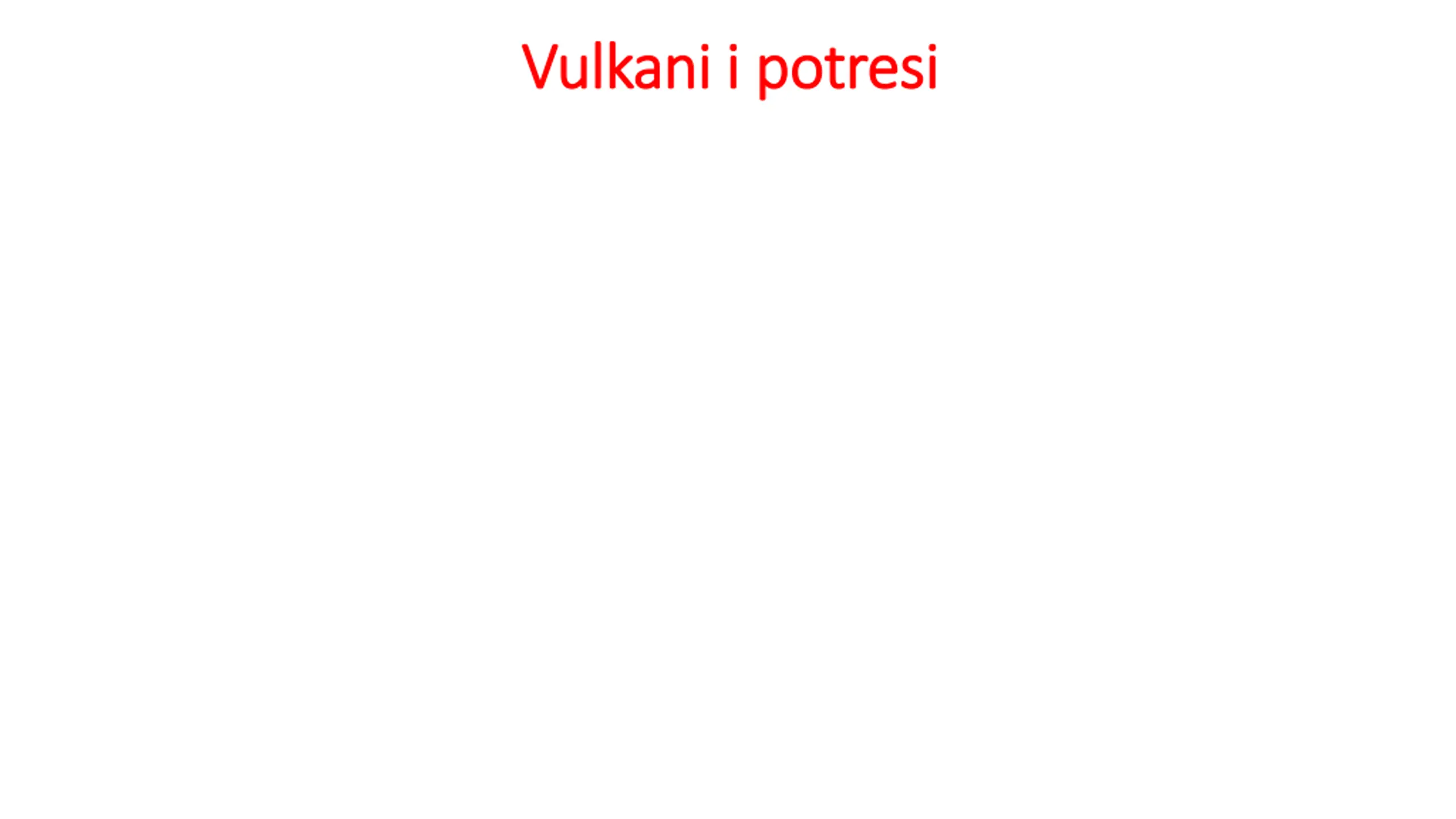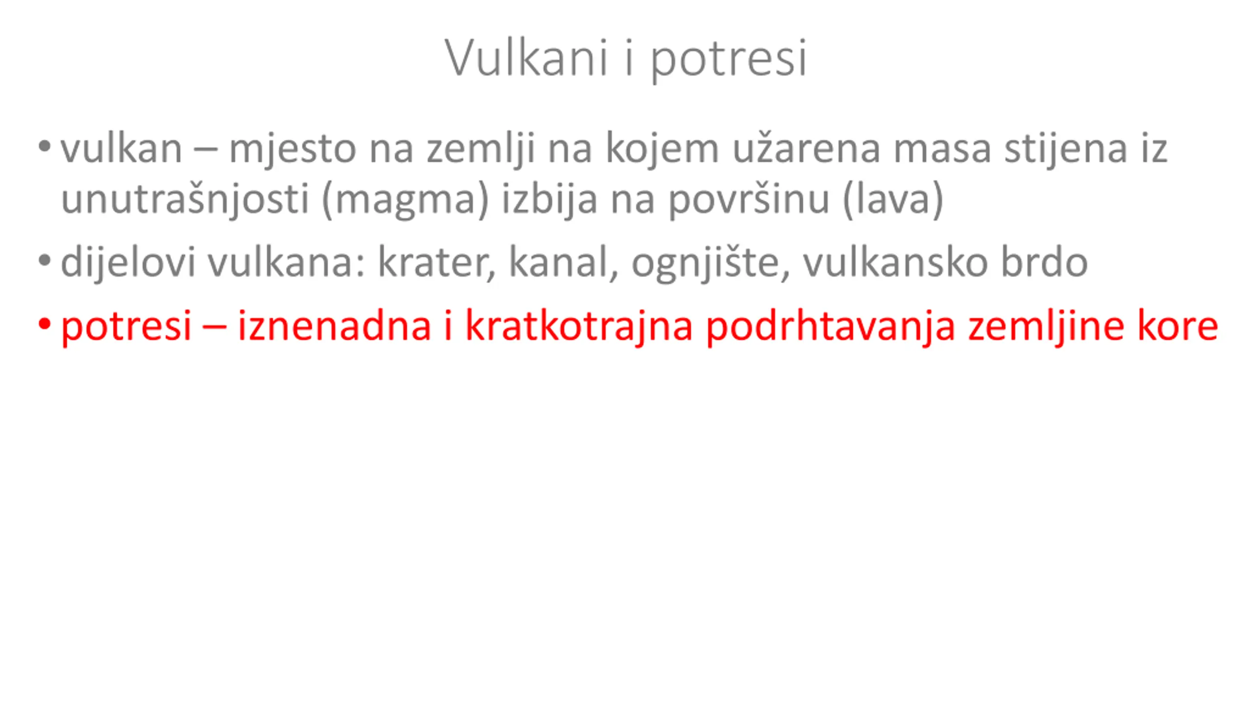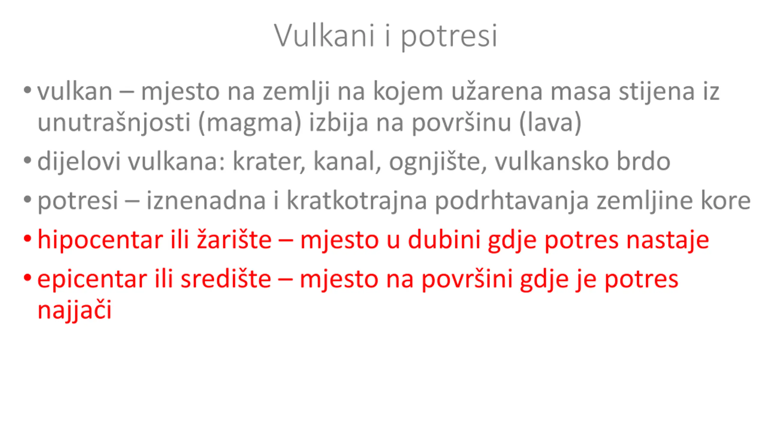 Vulkani i potresi vulkan mjesto na zemlji na kojem u arena masa stijena iz unutra njosti (magma) izbija na povr inu (lava) dijelovi vulkana: krater, kanal, ognji te, vulkansko brdo potresi iznenadna i kratkotrajna podrhtavanja zemljine kore hipocentar ili ari te mjesto u dubini gdje potres nastaje epicentar ili sredi te mjesto na povr ini gdje je potres najja i seizmograf ure aj za mjerenje ja ine potresa Richterova i Mercalijeva ljestvica ja ine potresa