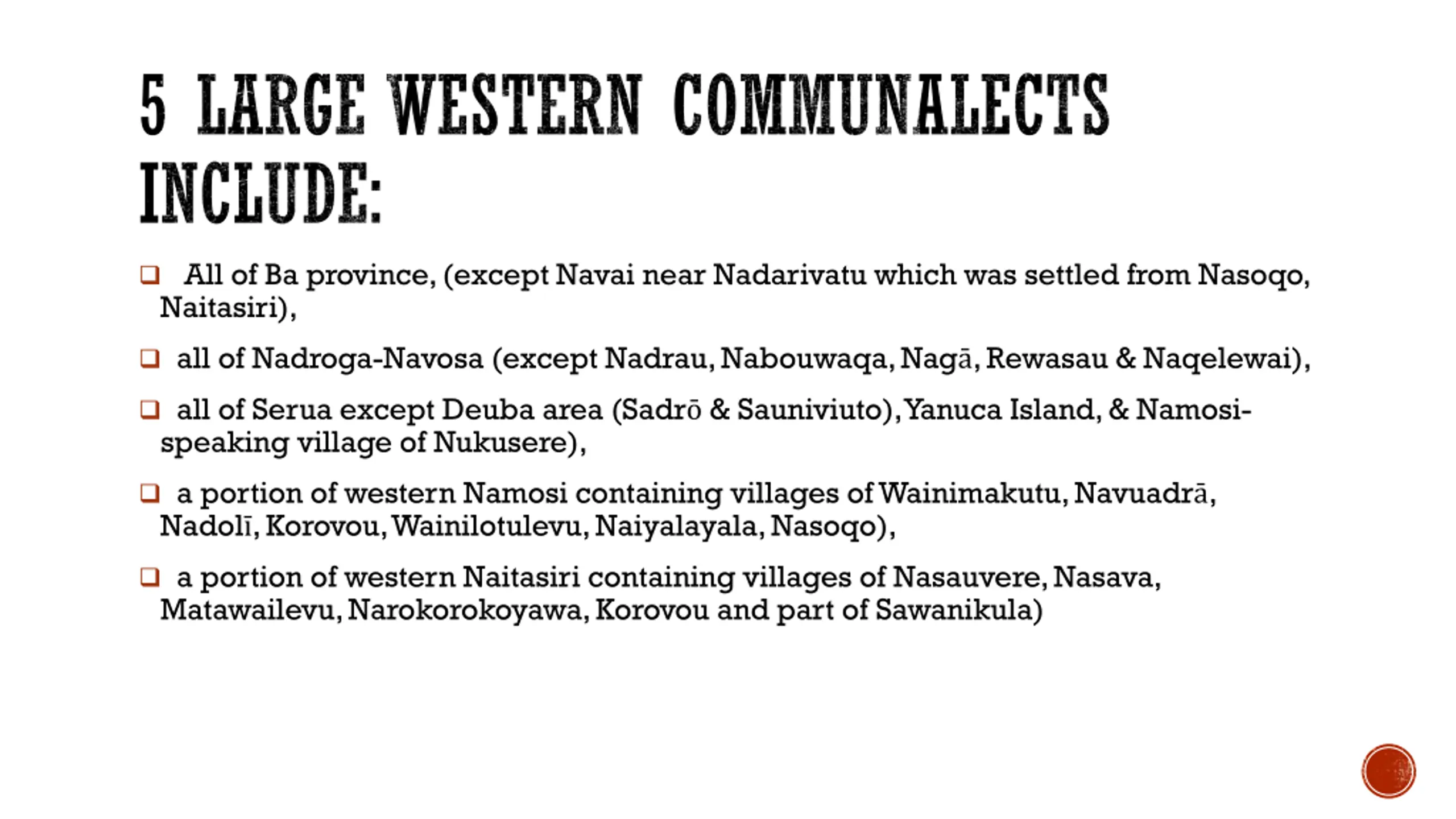 5 LARGE WESTERN COMMUNALECTS INCLUDE: All of Ba province, (except Navai near Nadarivatu which was settled from Nasoqo, Naitasiri), all of Nadroga-Navosa (except Nadrau, Nabouwaqa, Nag , Rewasau & Naqelewai), all of Serua except Deuba area (Sadr & Sauniviuto), Yanuca Island, & Namosi- speaking village of Nukusere), a portion of western Namosi containing villages of Wainimakutu, Navuadr , Nadol , Korovou, Wainilotulevu, Naiyalayala, Nasoqo), a portion of western Naitasiri containing villages of Nasauvere, Nasava, Matawailevu, Narokorokoyawa, Korovou and part of Sawanikula)
