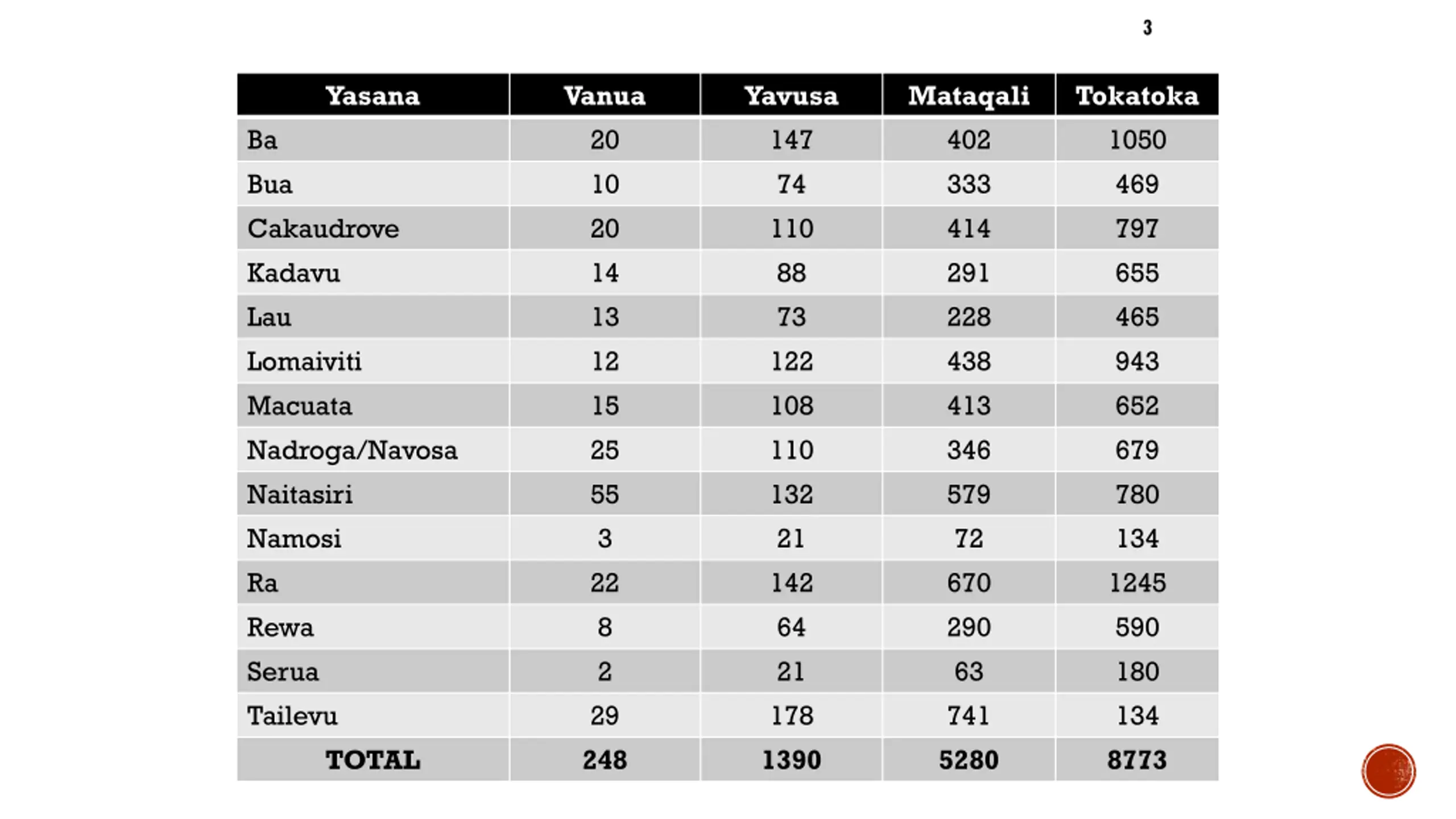 3 Yasana Vanua 20 10 20 14 13 12 15 25 55 3 22 8 2 29 248 Yavusa 147 74 110 88 73 122 108 110 132 21 142 64 21 178 1390 Mataqali 402 333 414 291 228 438 413 346 579 72 670 290 63 741 5280 Tokatoka 1050 469 797 655 465 943 652 679 780 134 1245 590 180 134 8773 Ba Bua Cakaudrove Kadavu Lau Lomaiviti Macuata Nadroga/Navosa Naitasiri Namosi Ra Rewa Serua Tailevu TOTAL