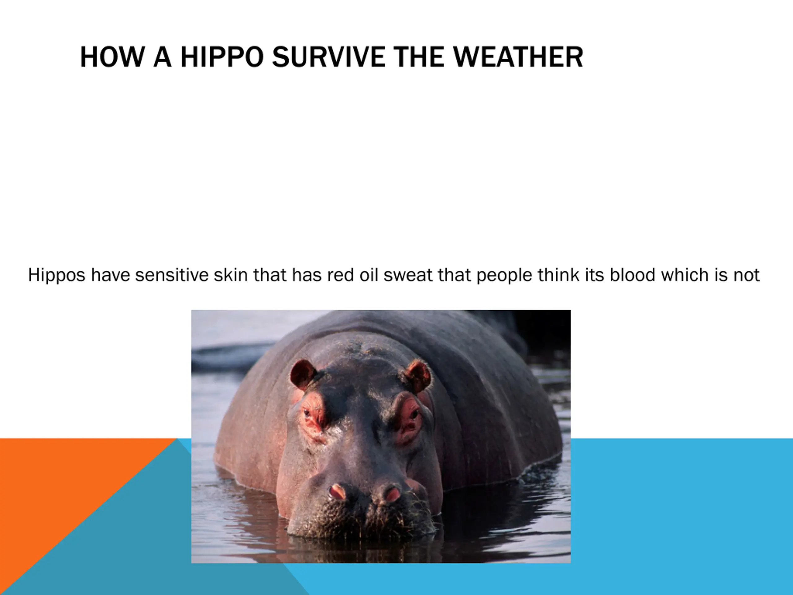 HOW A HIPPO SURVIVE THE WEATHER Hippos have sensitive skin that has red oil sweat that people think its blood which is not