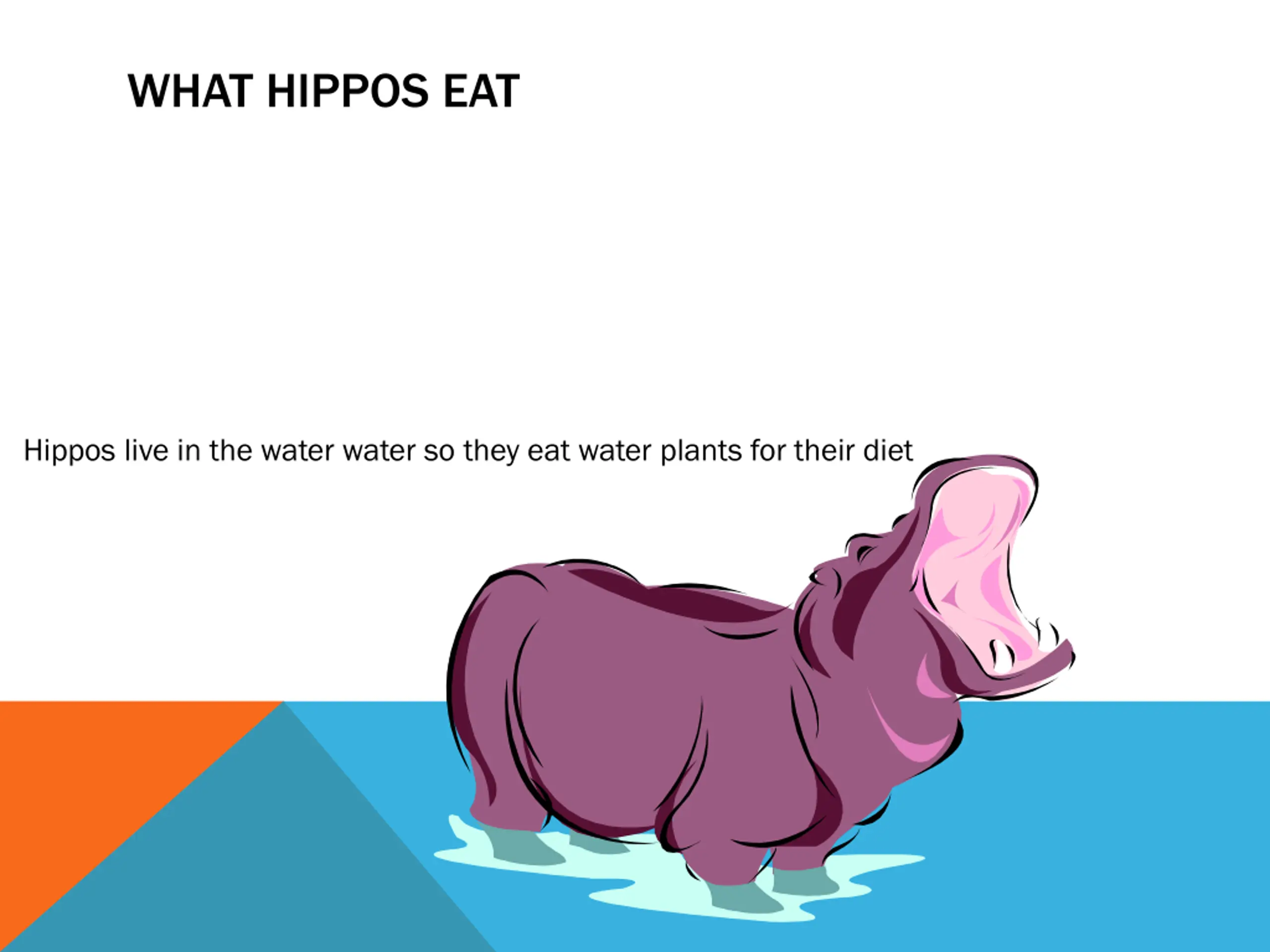 WHAT HIPPOS EAT Hippos live in the water water so they eat water plants for their diet