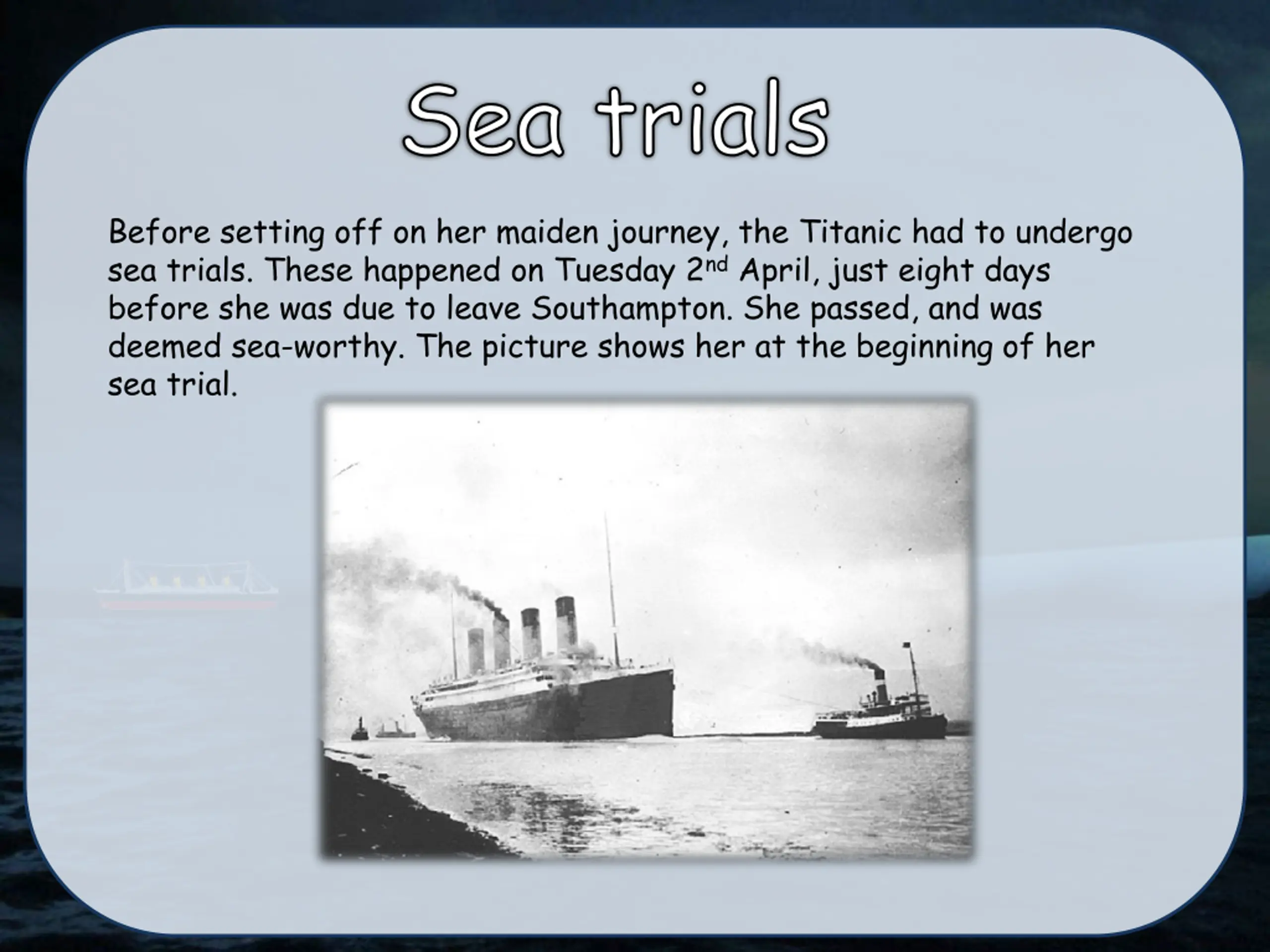 Sea trials Before setting off on her maiden journey, the Titanic had to undergo sea trials. These happened on Tuesday 2nd April, just eight days before she was due to leave Southampton. She passed, and was deemed sea-worthy. The picture shows her at the beginning of her sea trial.