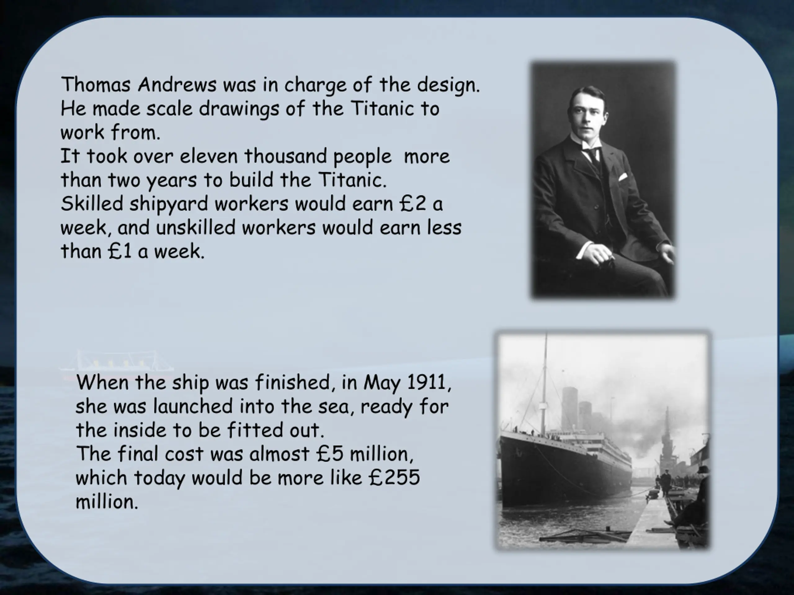 Thomas Andrews was in charge of the design. He made scale drawings of the Titanic to work from. It took over eleven thousand people more than two years to build the Titanic. Skilled shipyard workers would earn 2 a week, and unskilled workers would earn less than 1 a week. When the ship was finished, in May 1911, she was launched into the sea, ready for the inside to be fitted out. The final cost was almost 5 million, which today would be more like 255 million.