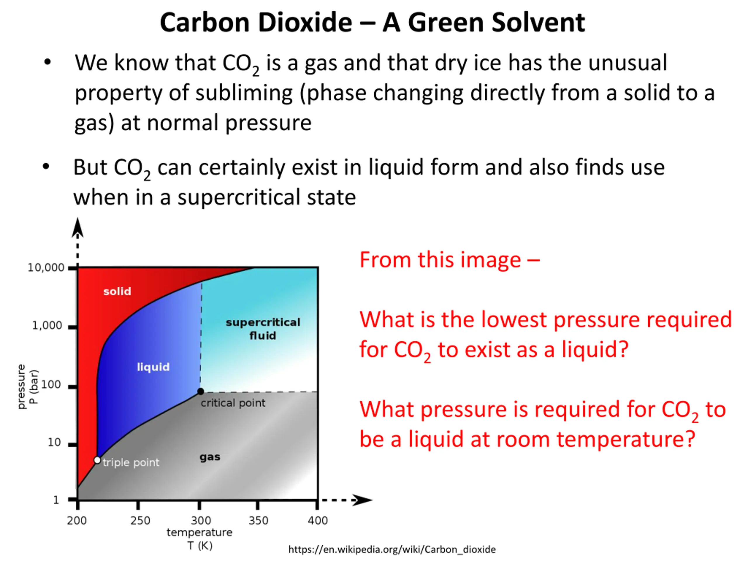 Carbon Dioxide A Green Solvent We know that CO2 is a gas and that dry ice has the unusual property of subliming (phase changing directly from a solid to a gas) at normal pressure But CO2 can certainly exist in liquid form and also finds use when in a supercritical state From this image What is the lowest pressure required for CO2 to exist as a liquid? What pressure is required for CO2 to be a liquid at room temperature? https://en.wikipedia.org/wiki/Carbon_dioxide