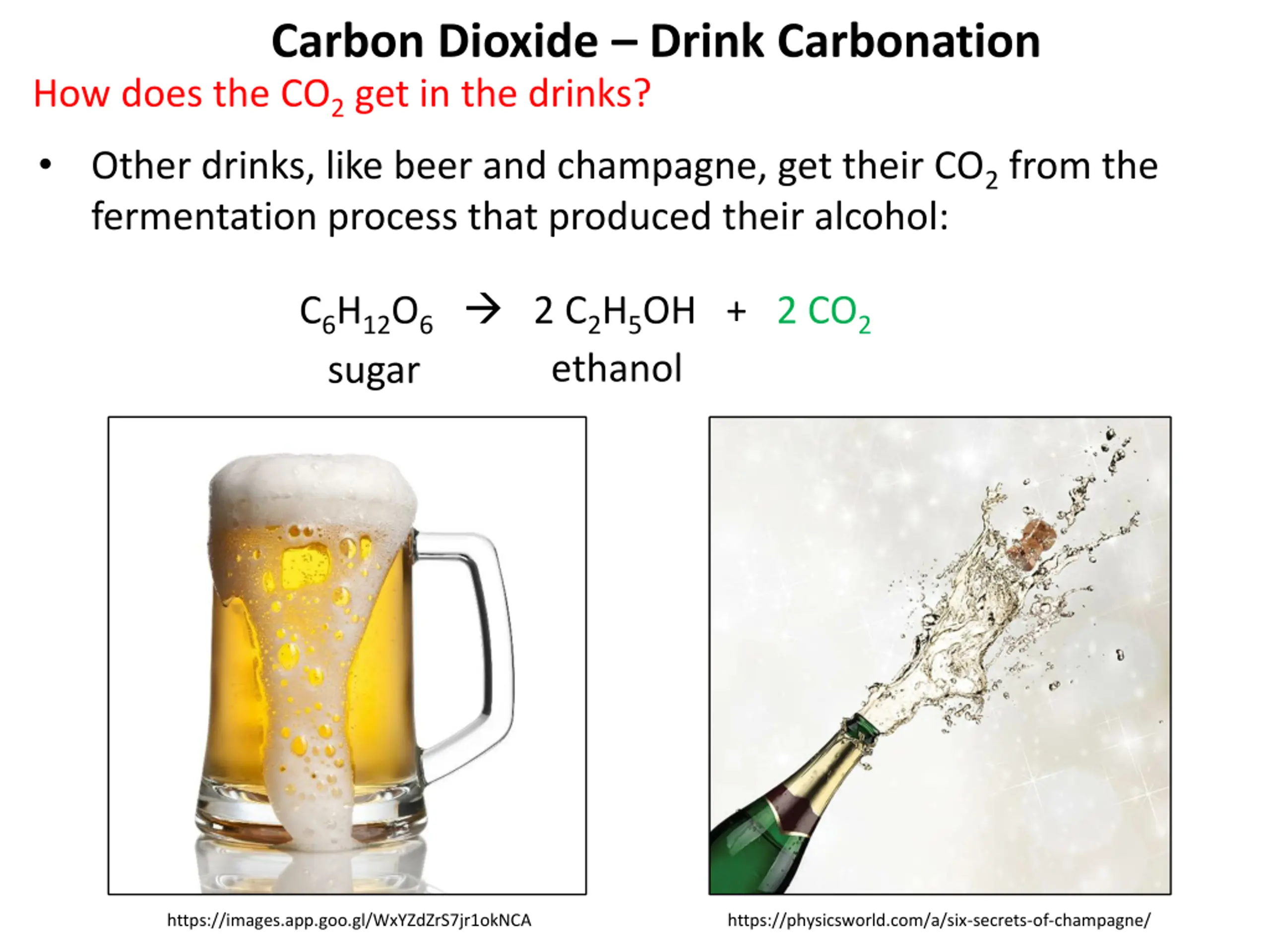 Carbon Dioxide Drink Carbonation How does the CO2 get in the drinks? Other drinks, like beer and champagne, get their CO2 from the fermentation process that produced their alcohol: C6H12O6 2 C2H5OH + 2 CO2 sugar ethanol https://images.app.goo.gl/WxYZdZrS7jr1okNCA https://physicsworld.com/a/six-secrets-of-champagne/