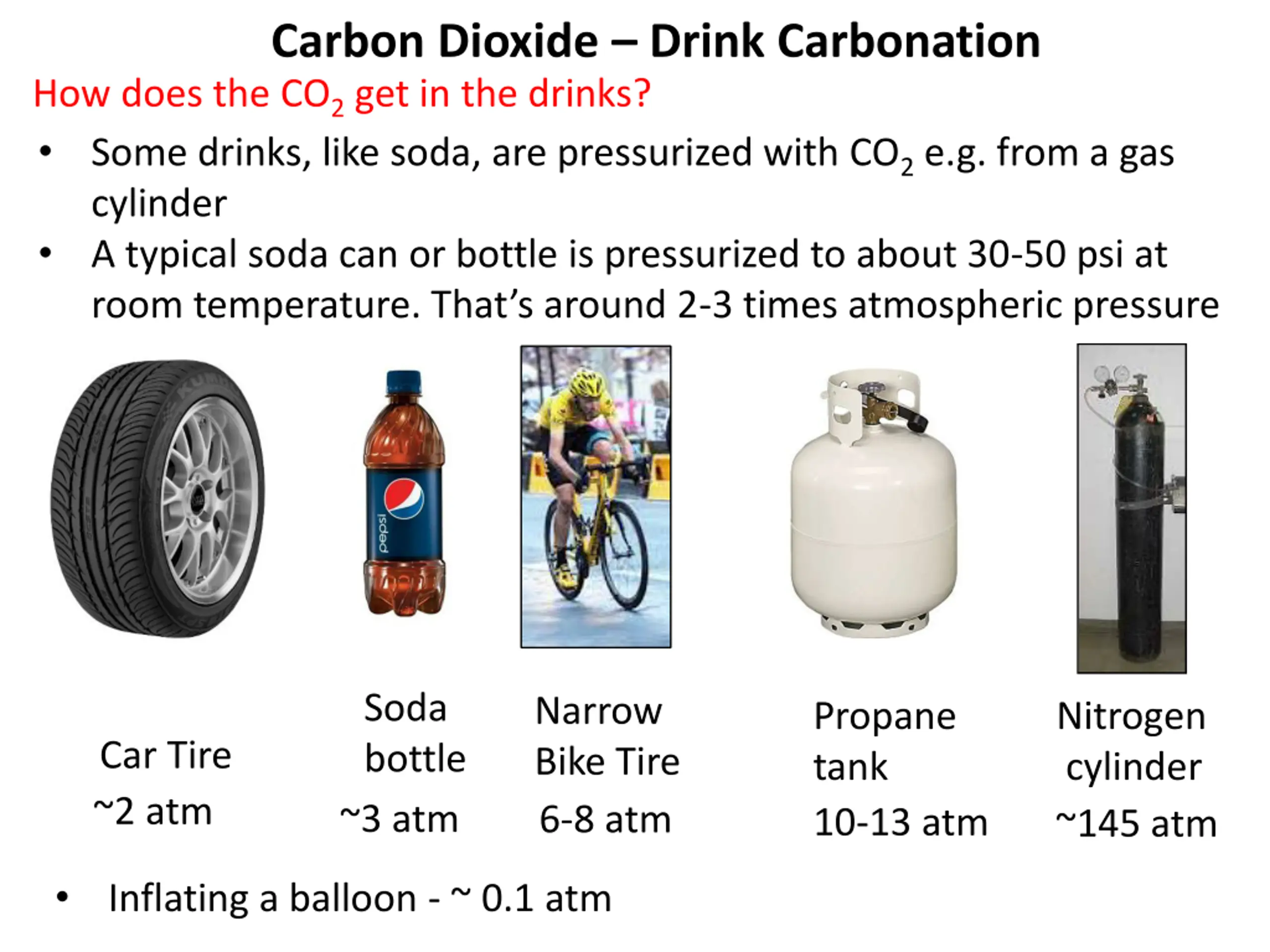 Carbon Dioxide Drink Carbonation How does the CO2 get in the drinks? Some drinks, like soda, are pressurized with CO2 e.g. from a gas cylinder A typical soda can or bottle is pressurized to about 30-50 psi at room temperature. That s around 2-3 times atmospheric pressure http://img1.targetimg1.com/wcsstore/TargetSAS/img/p/12/97/12979694.jpg http://www.ezcreditwarehouse.com/rims/images/tire_KU31.jpg Soda bottle ~3 atm Narrow Bike Tire 6-8 atm Propane tank 10-13 atm Nitrogen cylinder ~145 atm Car Tire ~2 atm Inflating a balloon - ~ 0.1 atm