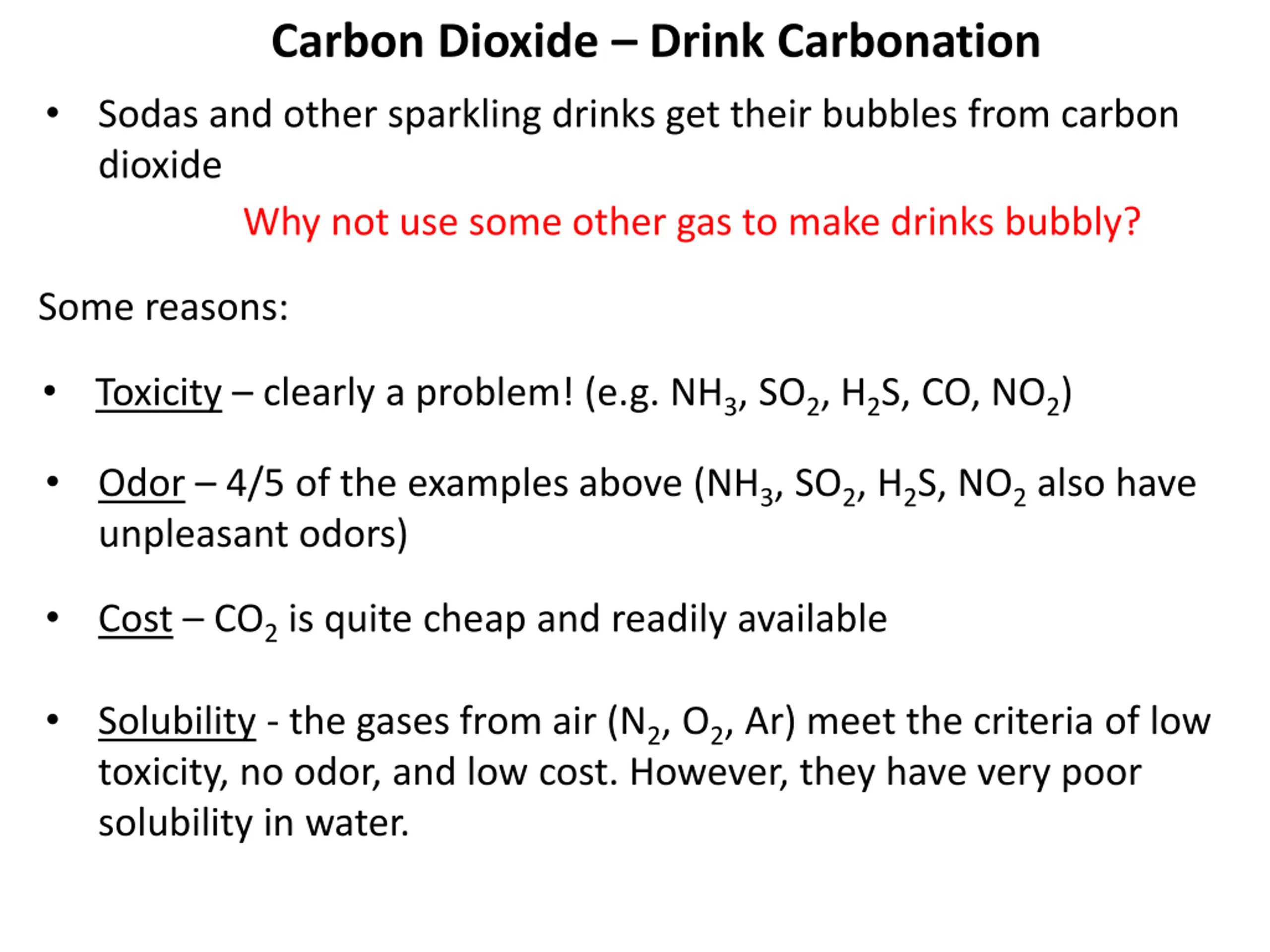 Carbon Dioxide Drink Carbonation Sodas and other sparkling drinks get their bubbles from carbon dioxide Why not use some other gas to make drinks bubbly? Some reasons: Toxicity clearly a problem! (e.g. NH3, SO2, H2S, CO, NO2) Odor 4/5 of the examples above (NH3, SO2, H2S, NO2 also have unpleasant odors) Cost CO2 is quite cheap and readily available Solubility - the gases from air (N2, O2, Ar) meet the criteria of low toxicity, no odor, and low cost. However, they have very poor solubility in water.