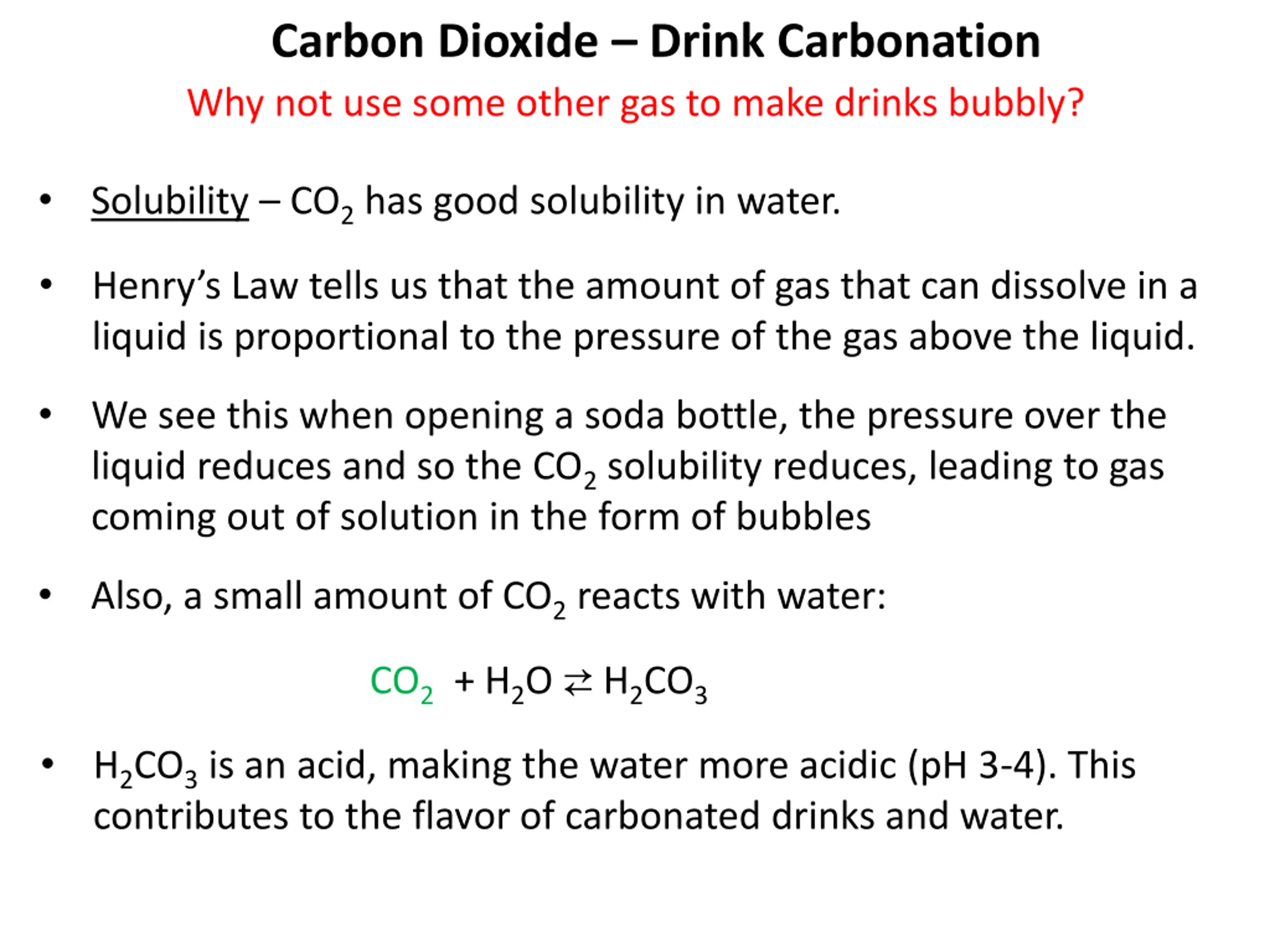 Carbon Dioxide Drink Carbonation Why not use some other gas to make drinks bubbly? Solubility CO2 has good solubility in water. Henry s Law tells us that the amount of gas that can dissolve in a liquid is proportional to the pressure of the gas above the liquid. We see this when opening a soda bottle, the pressure over the liquid reduces and so the CO2 solubility reduces, leading to gas coming out of solution in the form of bubbles Also, a small amount of CO2 reacts with water: CO2 + H2O H2CO3 H2CO3 is an acid, making the water more acidic (pH 3-4). This contributes to the flavor of carbonated drinks and water.