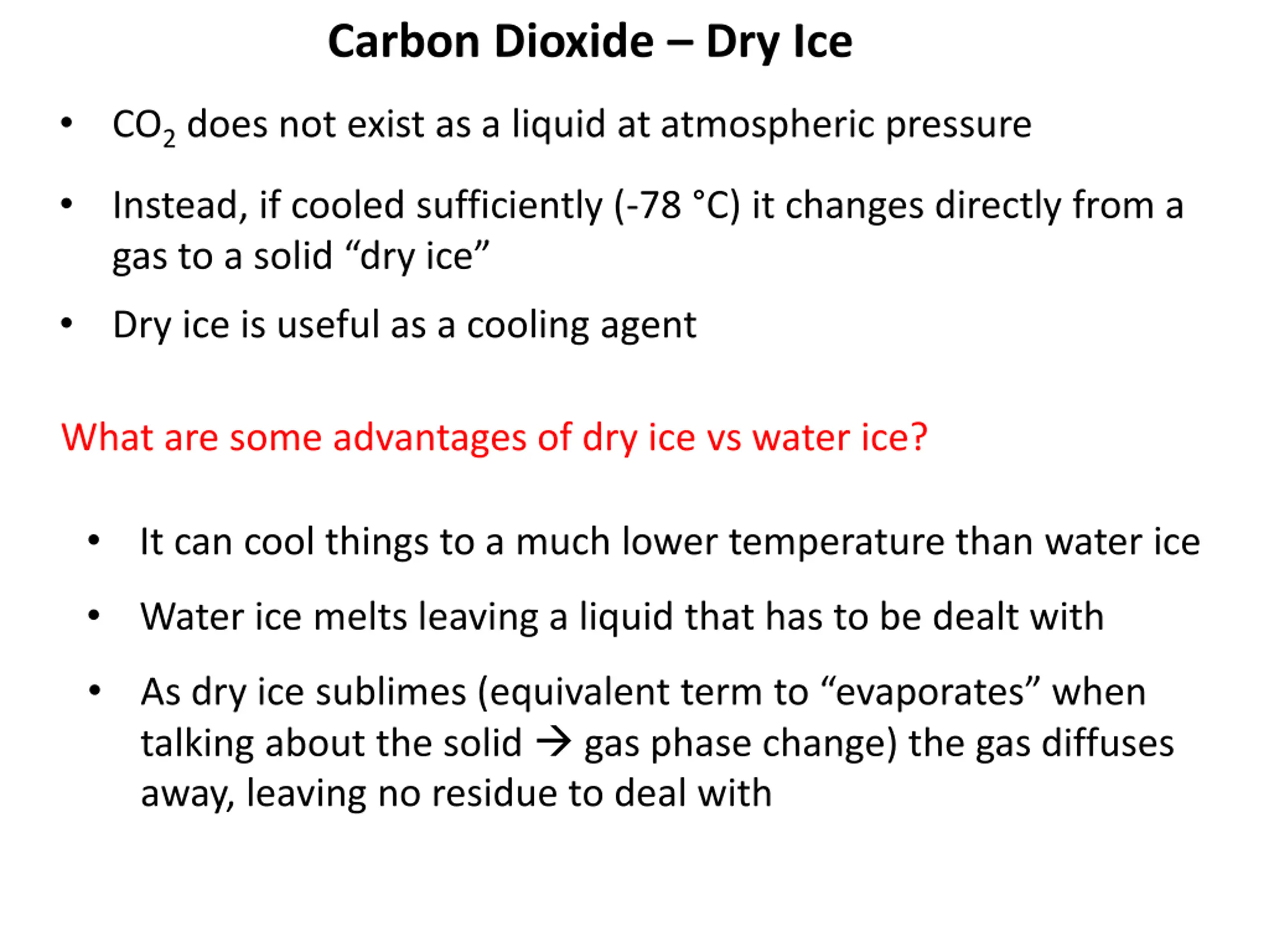 Carbon Dioxide Dry Ice CO2 does not exist as a liquid at atmospheric pressure Instead, if cooled sufficiently (-78 C) it changes directly from a gas to a solid dry ice Dry ice is useful as a cooling agent What are some advantages of dry ice vs water ice? It can cool things to a much lower temperature than water ice Water ice melts leaving a liquid that has to be dealt with As dry ice sublimes (equivalent term to evaporates when talking about the solid gas phase change) the gas diffuses away, leaving no residue to deal with