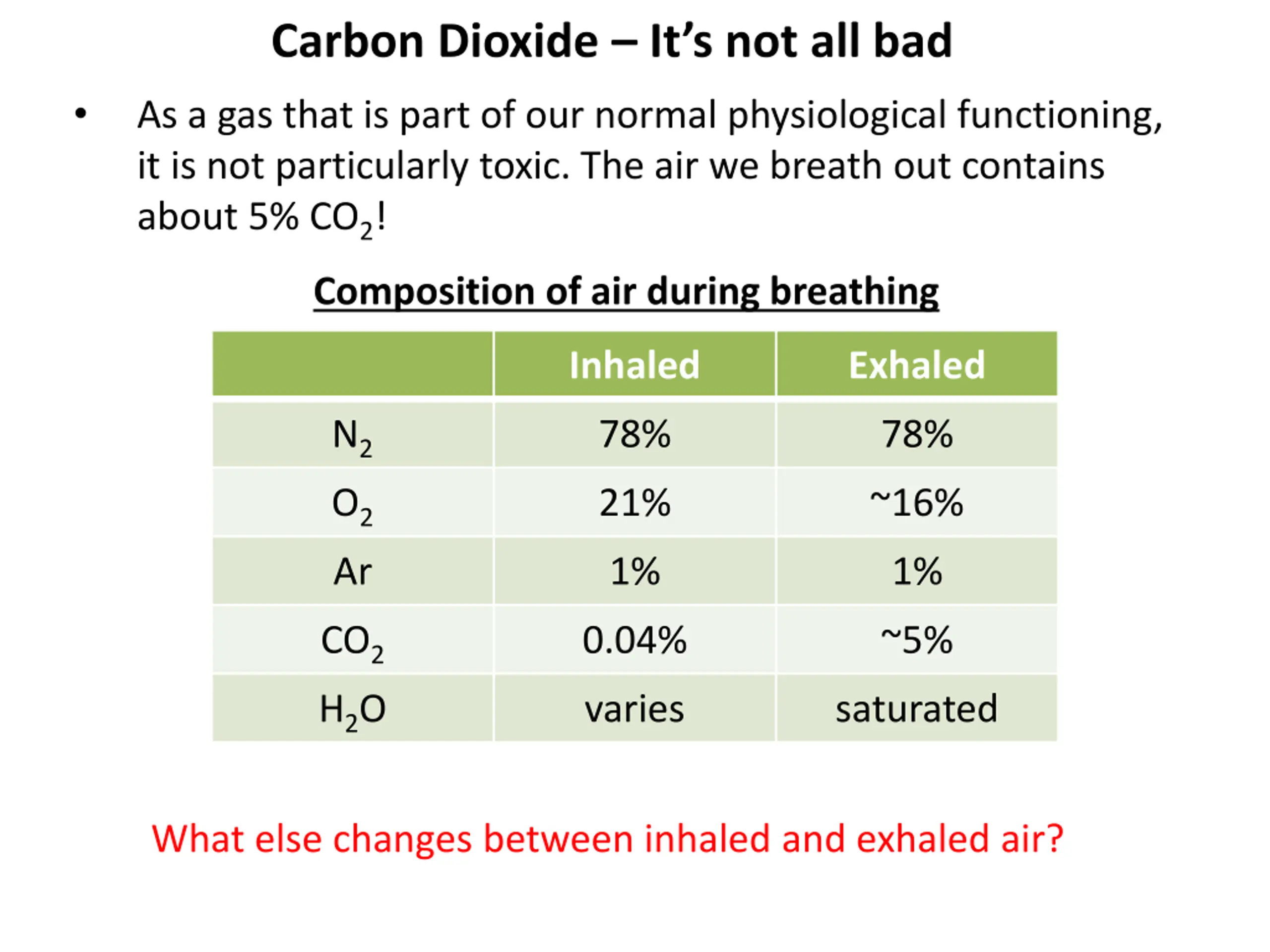 Carbon Dioxide Its not all bad As a gas that is part of our normal physiological functioning, it is not particularly toxic. The air we breath out contains about 5% CO2! Composition of air during breathing Inhaled Exhaled N2 O2 Ar 78% 78% 21% ~16% 1% 1% CO2 H2O 0.04% ~5% varies saturated What else changes between inhaled and exhaled air?
