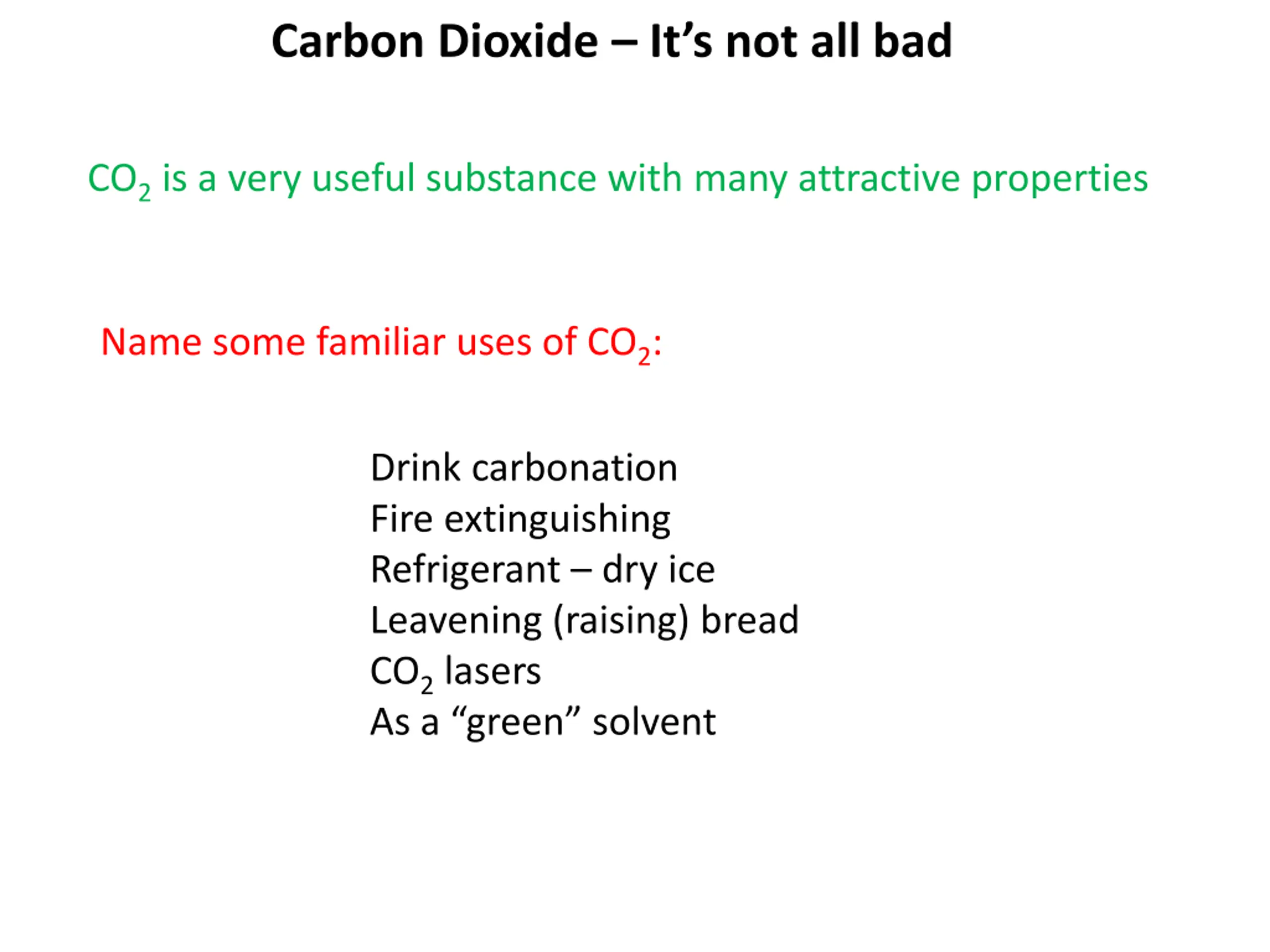 Carbon Dioxide Its not all bad CO2 is a very useful substance with many attractive properties Name some familiar uses of CO2: Drink carbonation Fire extinguishing Refrigerant dry ice Leavening (raising) bread CO2 lasers As a green solvent