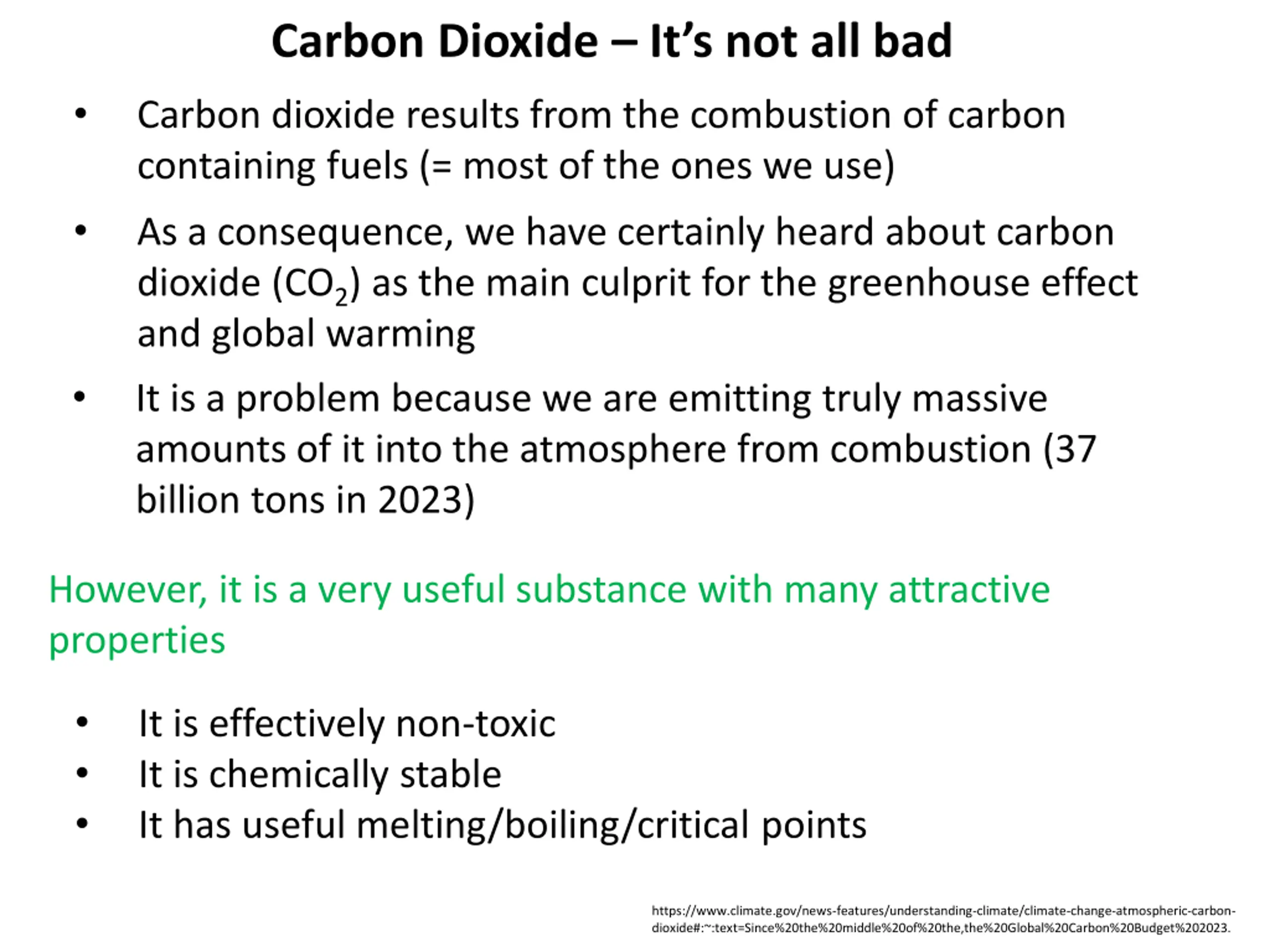 Carbon Dioxide Its not all bad Carbon dioxide results from the combustion of carbon containing fuels (= most of the ones we use) As a consequence, we have certainly heard about carbon dioxide (CO2) as the main culprit for the greenhouse effect and global warming It is a problem because we are emitting truly massive amounts of it into the atmosphere from combustion (37 billion tons in 2023) However, it is a very useful substance with many attractive properties It is effectively non-toxic It is chemically stable It has useful melting/boiling/critical points https://www.climate.gov/news-features/understanding-climate/climate-change-atmospheric-carbon- dioxide#:~:text=Since%20the%20middle%20of%20the,the%20Global%20Carbon%20Budget%202023.