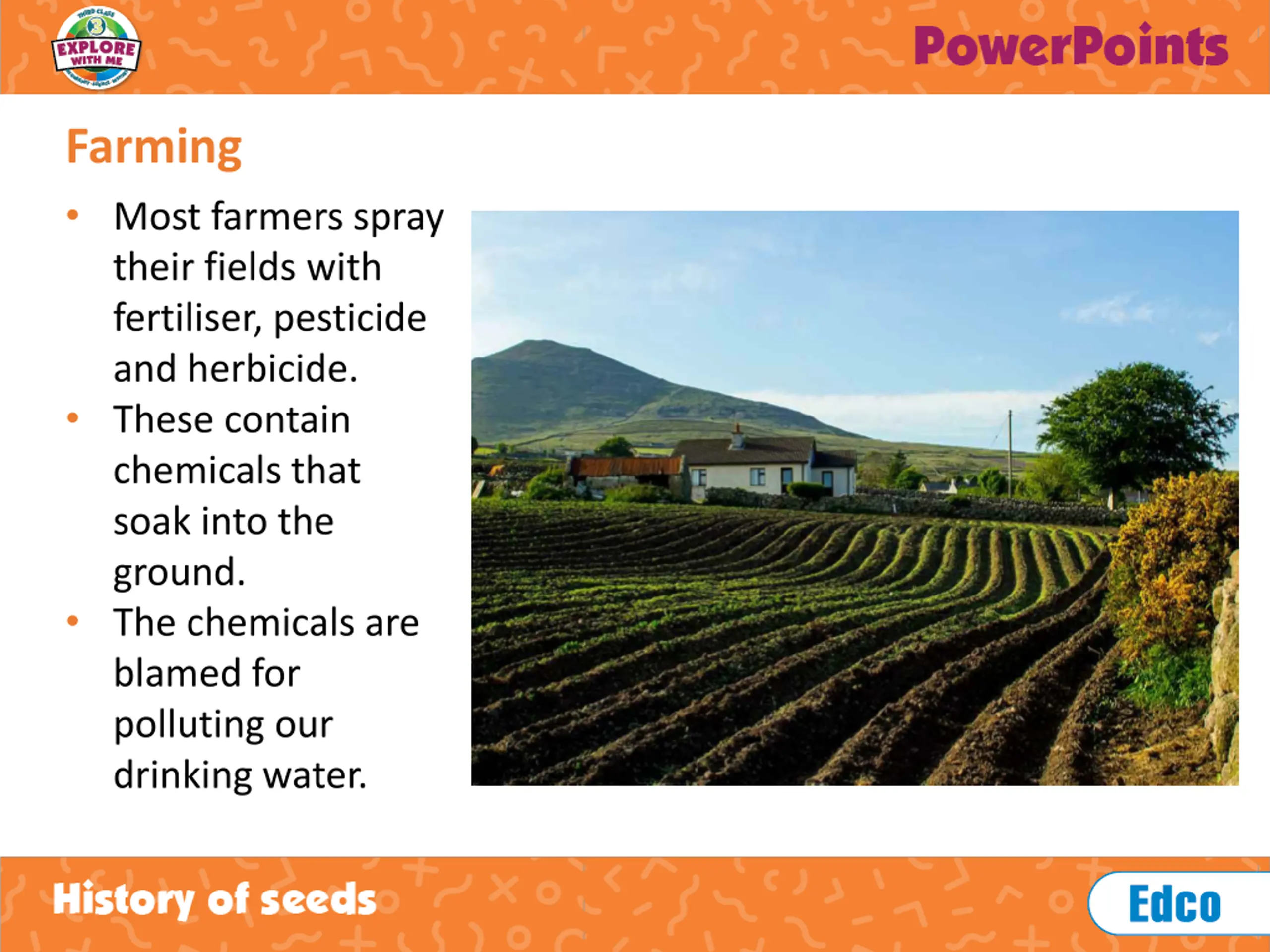Farming Most farmers spray their fields with fertiliser, pesticide and herbicide. These contain chemicals that soak into the ground. The chemicals are blamed for polluting our drinking water.