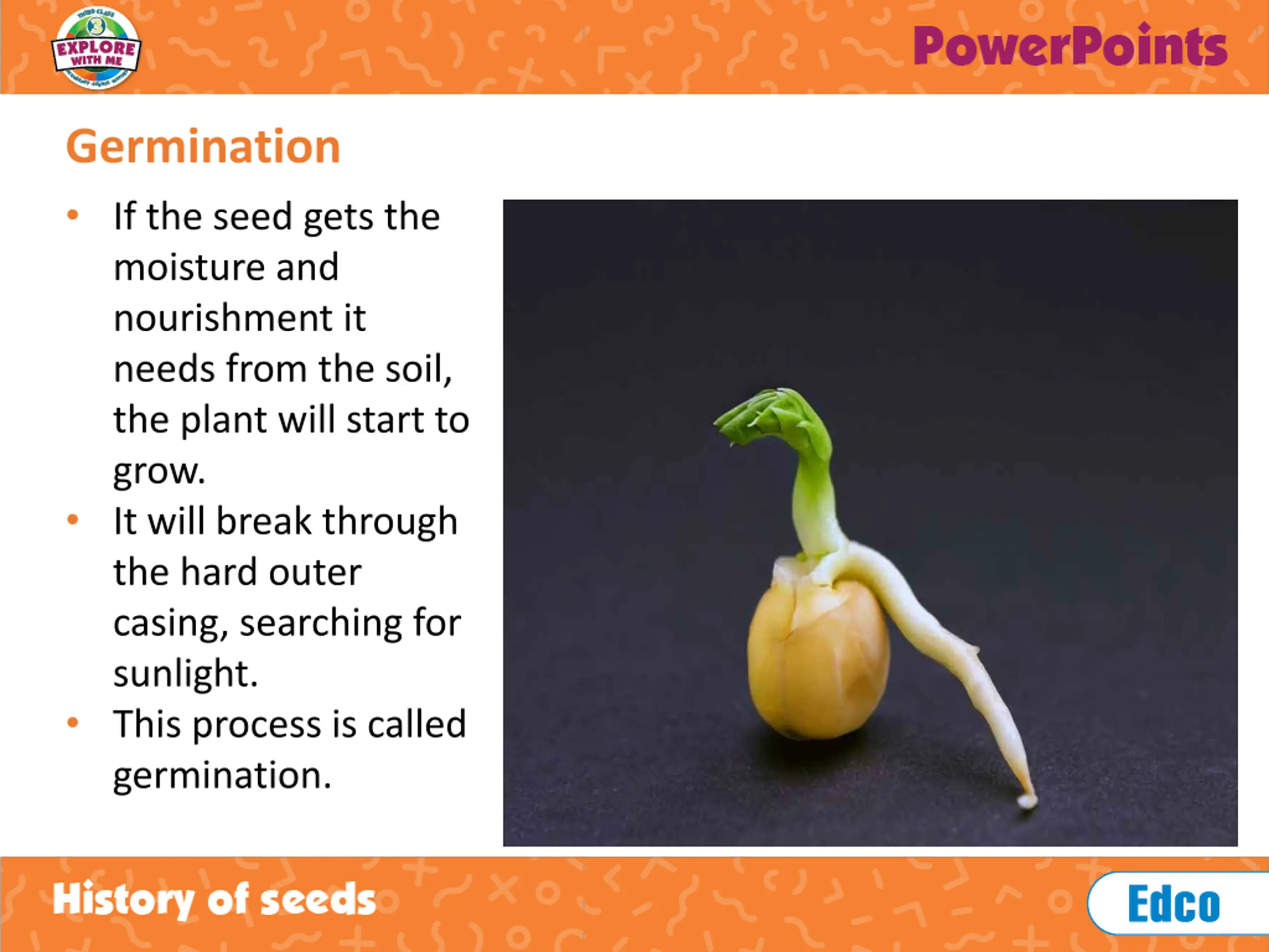 Germination If the seed gets the moisture and nourishment it needs from the soil, the plant will start to grow. It will break through the hard outer casing, searching for sunlight. This process is called germination.