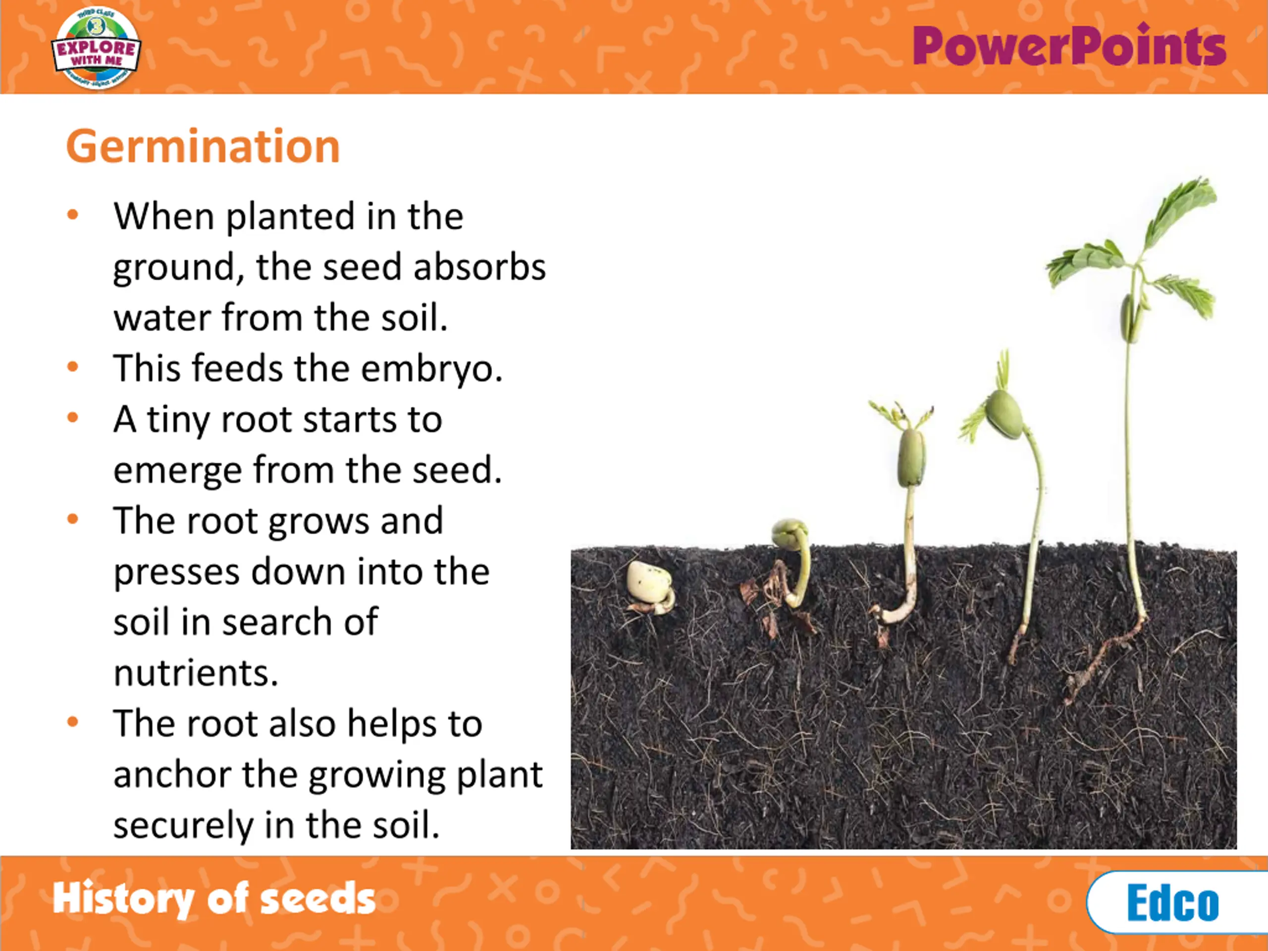 Germination When planted in the ground, the seed absorbs water from the soil. This feeds the embryo. A tiny root starts to emerge from the seed. The root grows and presses down into the soil in search of nutrients. The root also helps to anchor the growing plant securely in the soil.