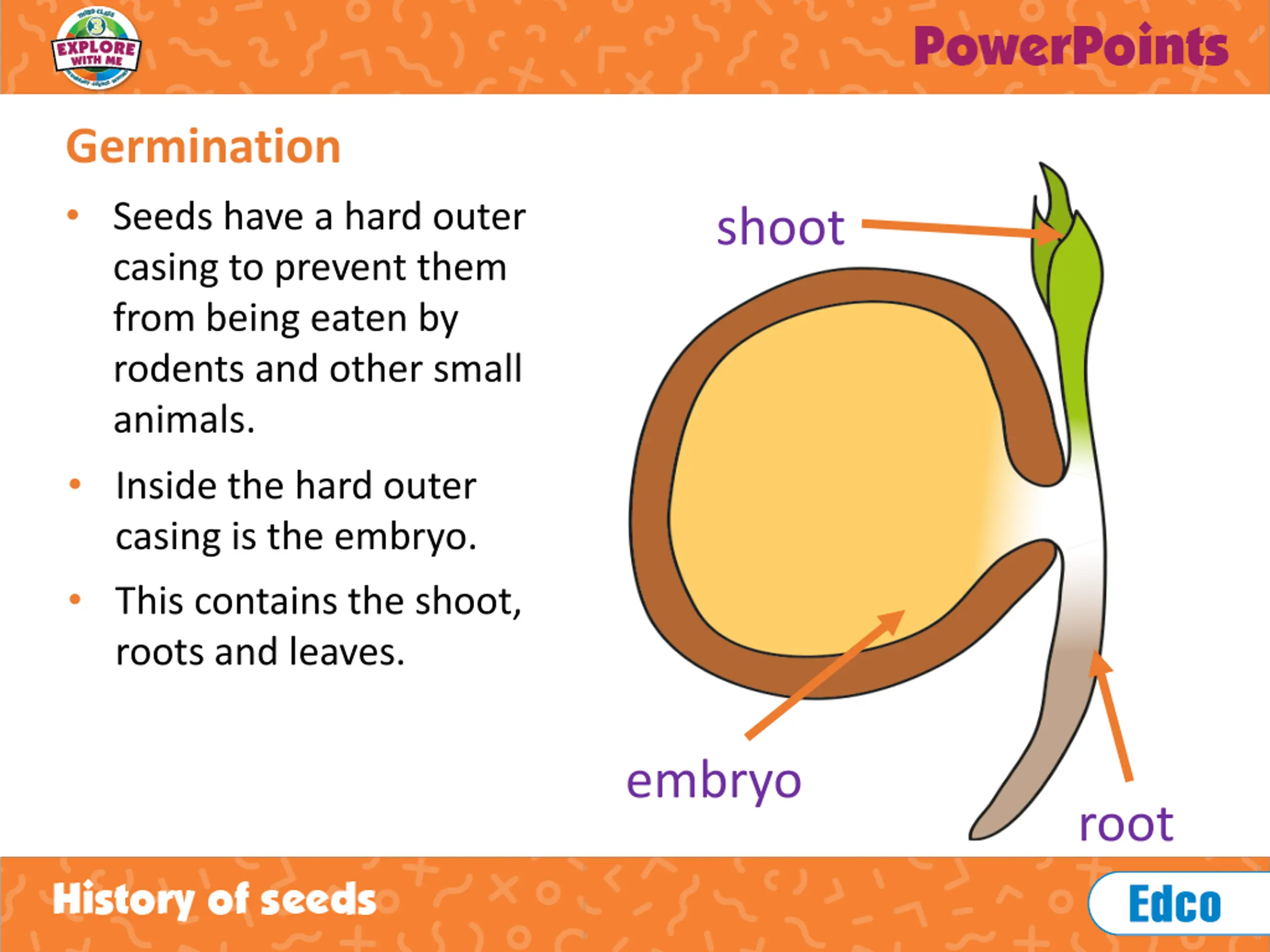 Germination Seeds have a hard outer casing to prevent them from being eaten by rodents and other small animals. Inside the hard outer casing is the embryo. This contains the shoot, roots and leaves. shoot embryo root