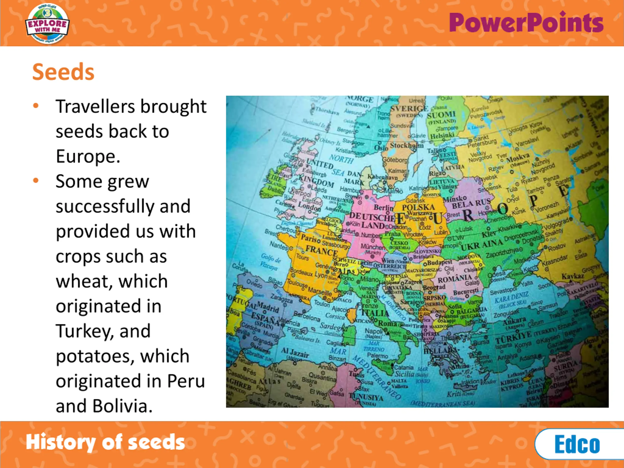 Seeds Travellers brought seeds back to Europe. Some grew successfully and provided us with crops such as wheat, which originated in Turkey, and potatoes, which originated in Peru and Bolivia.