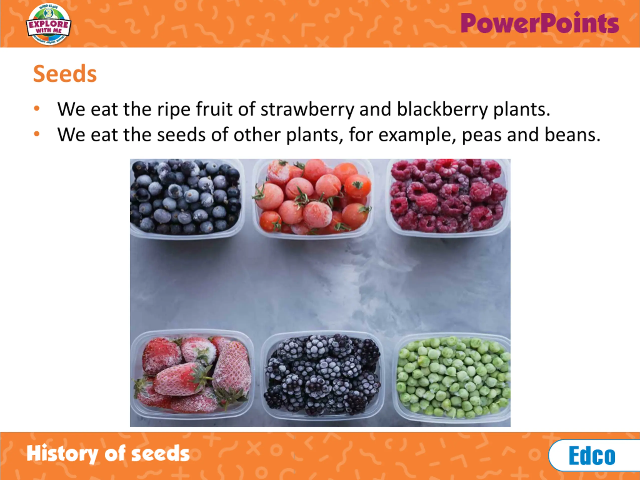 Seeds We eat the ripe fruit of strawberry and blackberry plants. We eat the seeds of other plants, for example, peas and beans.