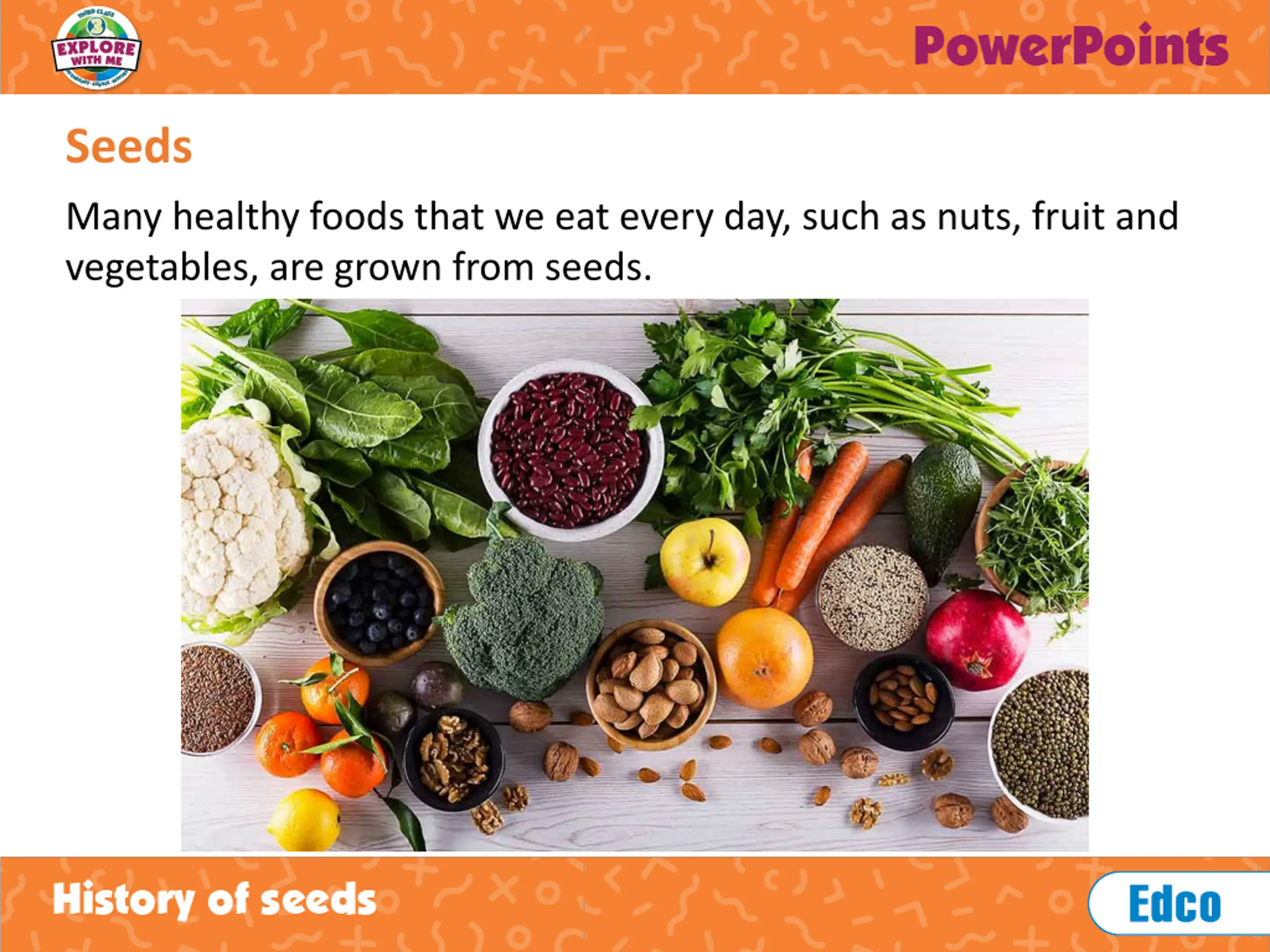 Seeds Many healthy foods that we eat every day, such as nuts, fruit and vegetables, are grown from seeds.