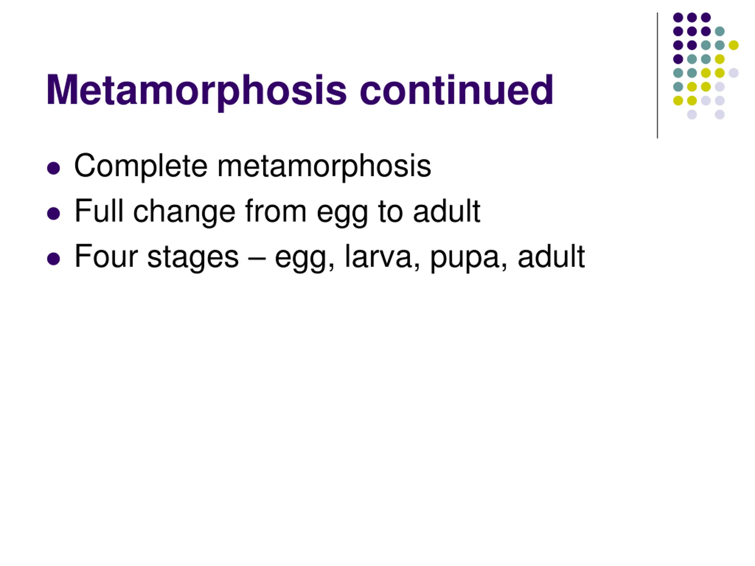 Metamorphosis continued Complete metamorphosis Full change from egg to adult Four stages egg, larva, pupa, adult