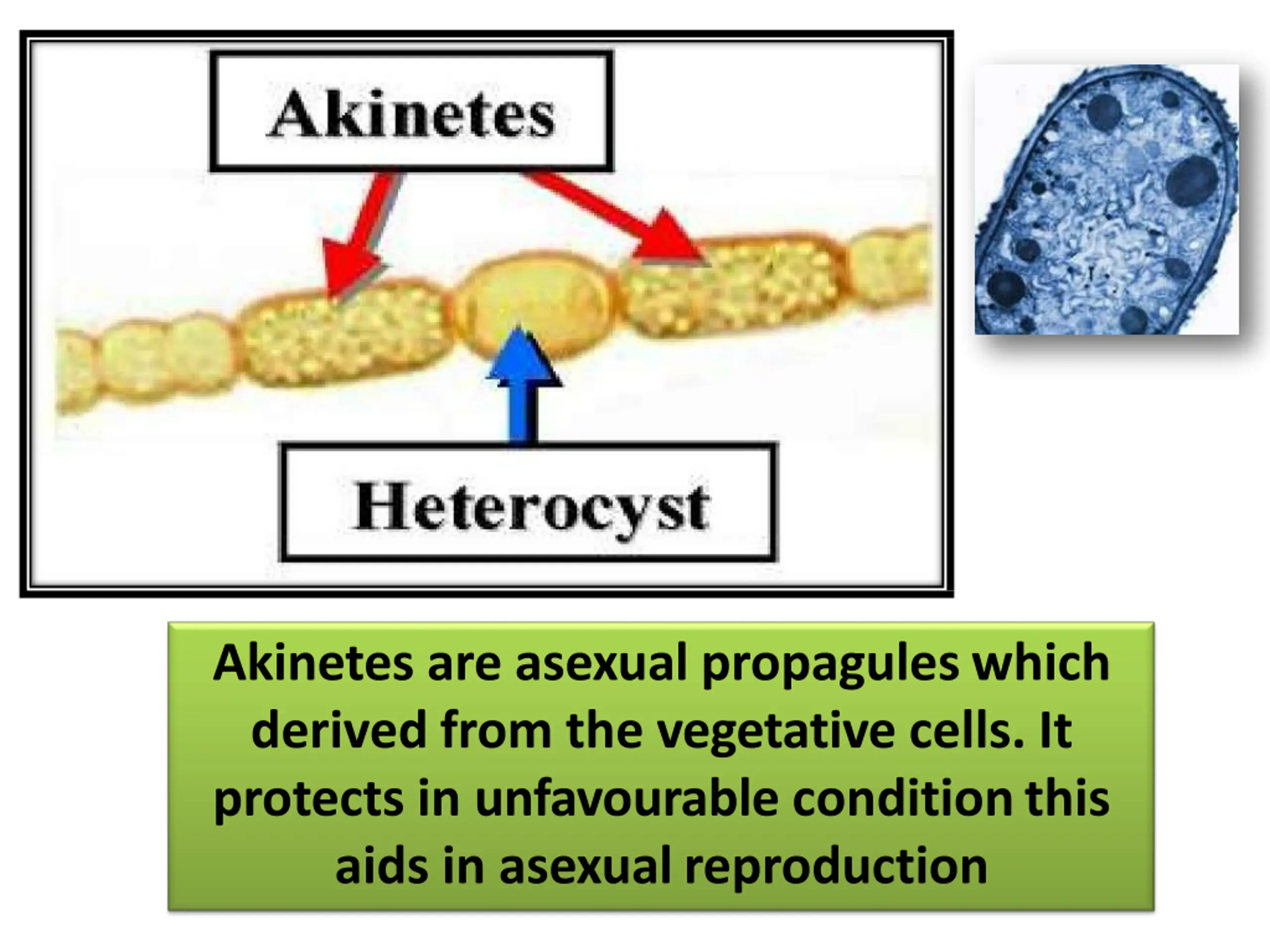 Akinetes are asexual propaguleswhich derived from the vegetative cells. It protects in unfavourable conditionthis aids in asexualreproduction