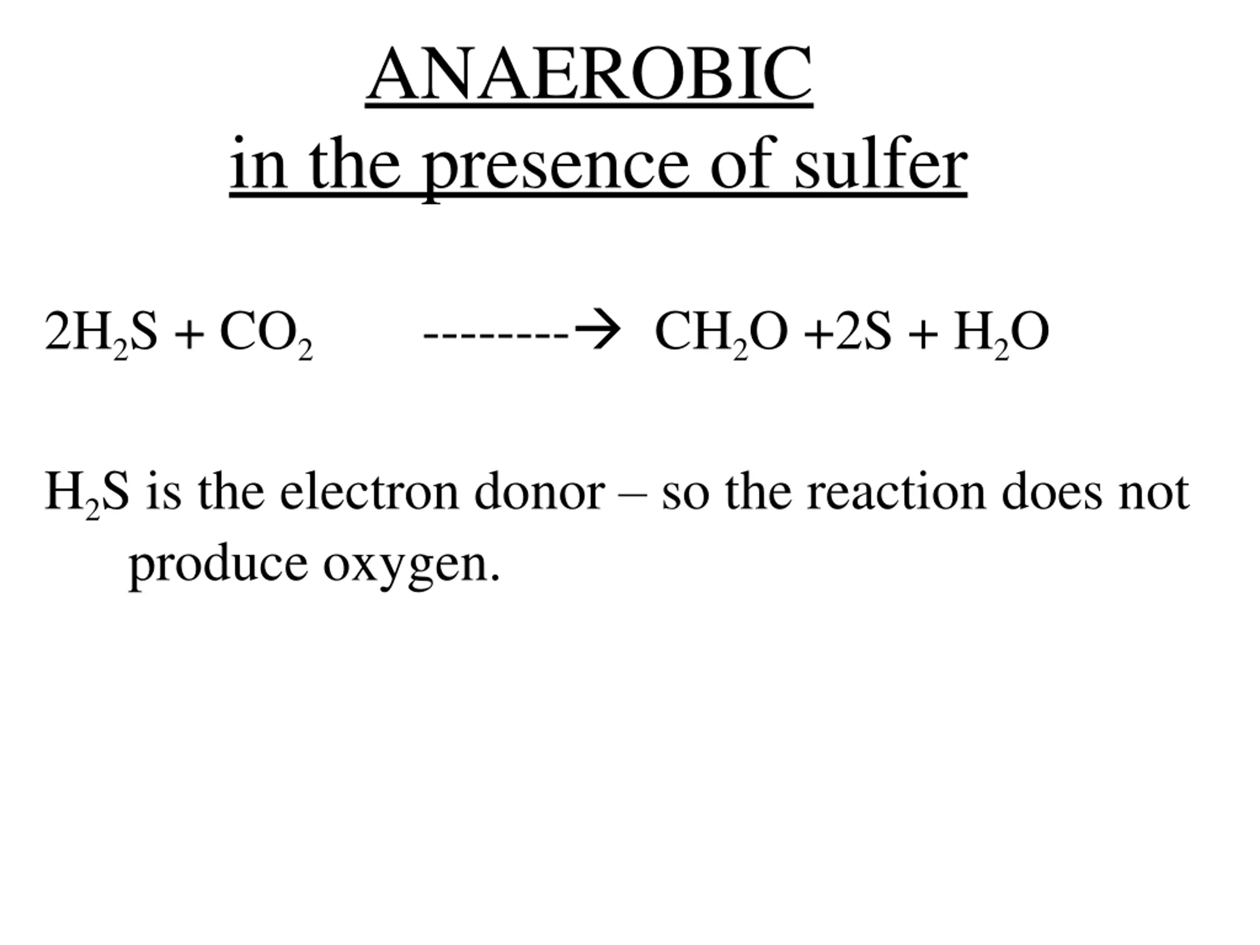 ANAEROBIC in the presence of sulfer 2H2S + CO2 -------- CH2O +2S + H2O H2S is the electron donor so the reaction does not produce oxygen.