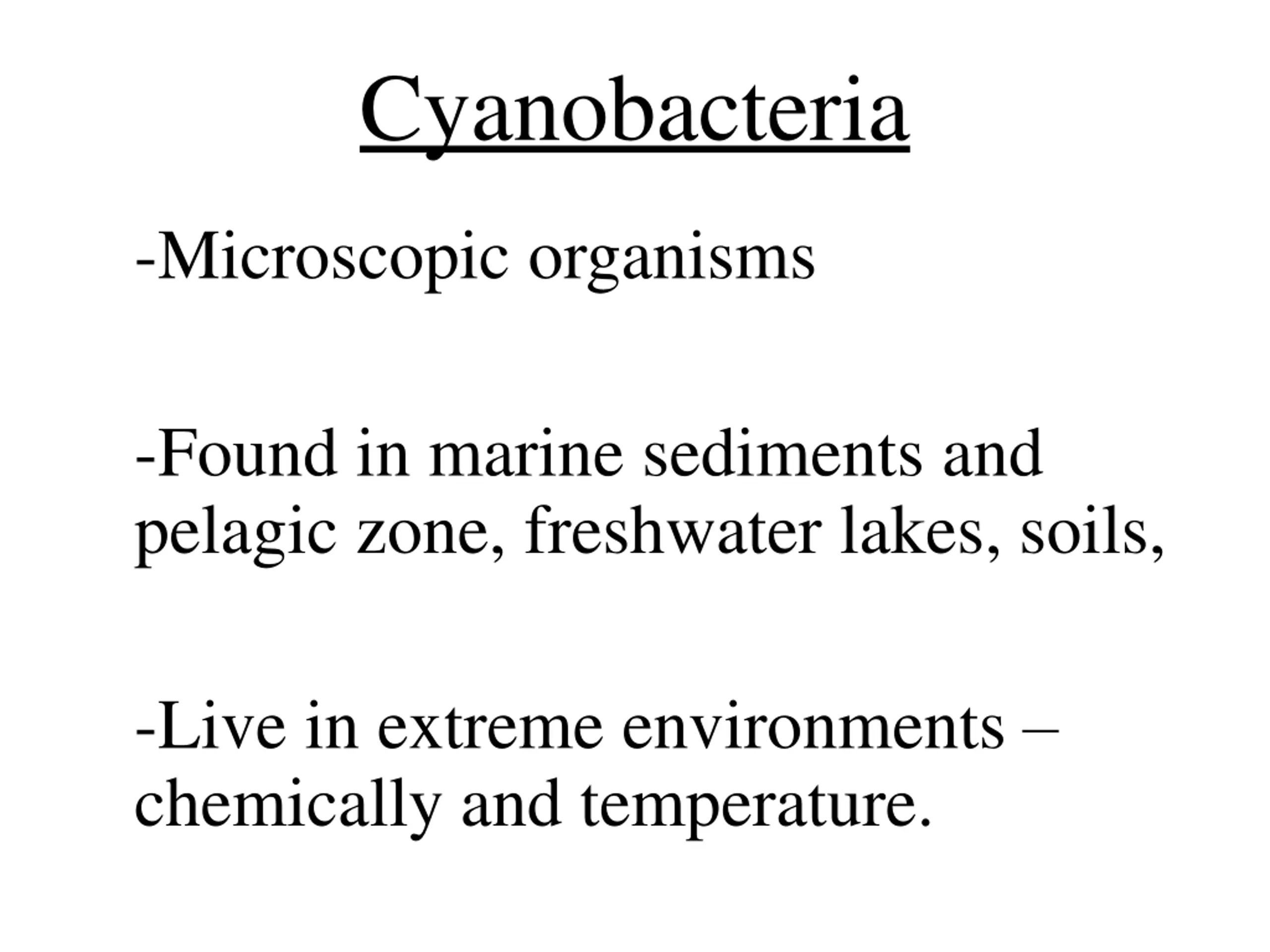 Cyanobacteria -Microscopic organisms -Found in marine sediments and pelagic zone, freshwater lakes, soils, -Live in extreme environments chemically and temperature.