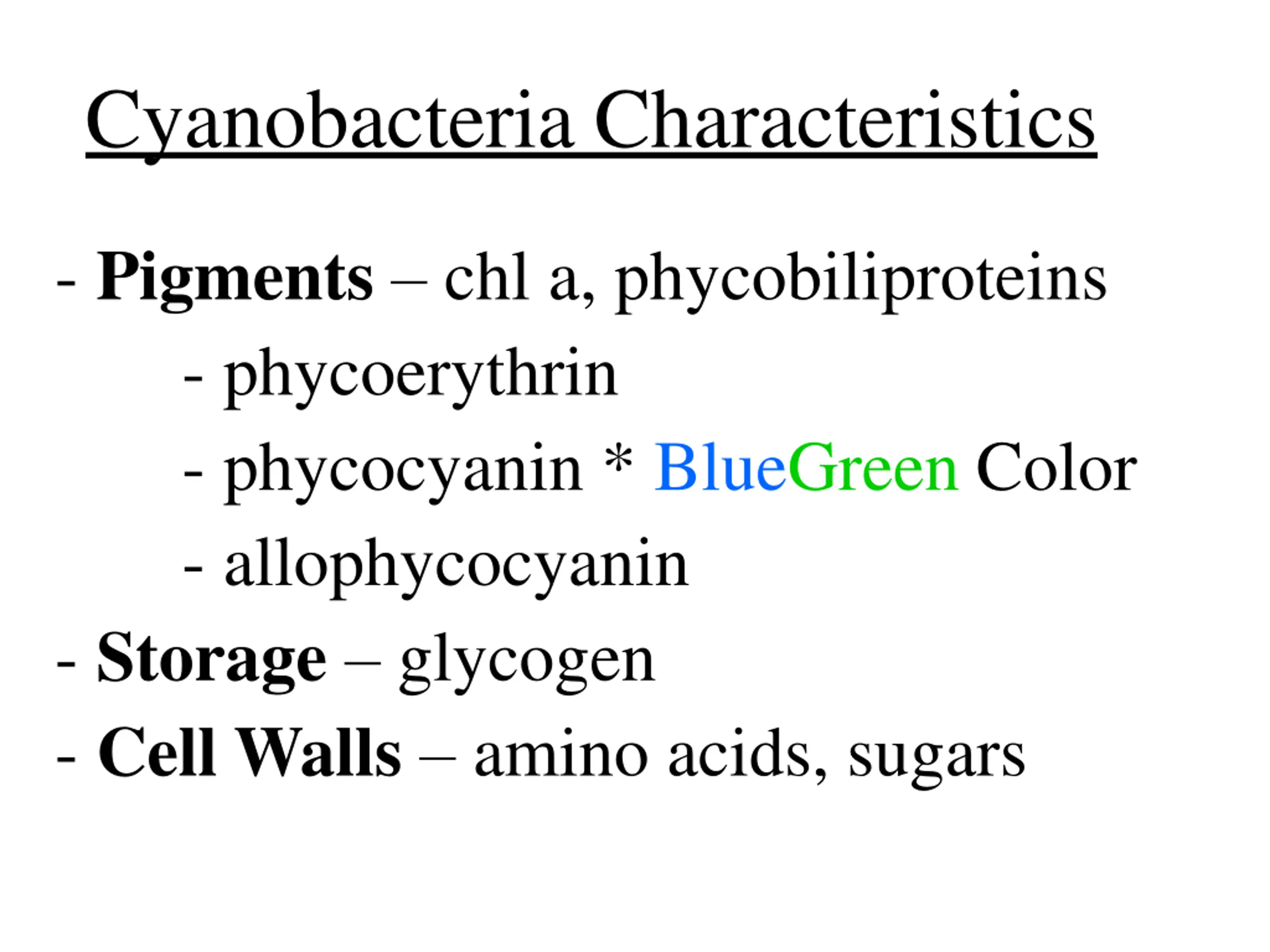 Cyanobacteria Characteristics - Pigments chl a, phycobiliproteins - phycoerythrin - phycocyanin * BlueGreen Color - allophycocyanin - Storage glycogen - Cell Walls amino acids, sugars