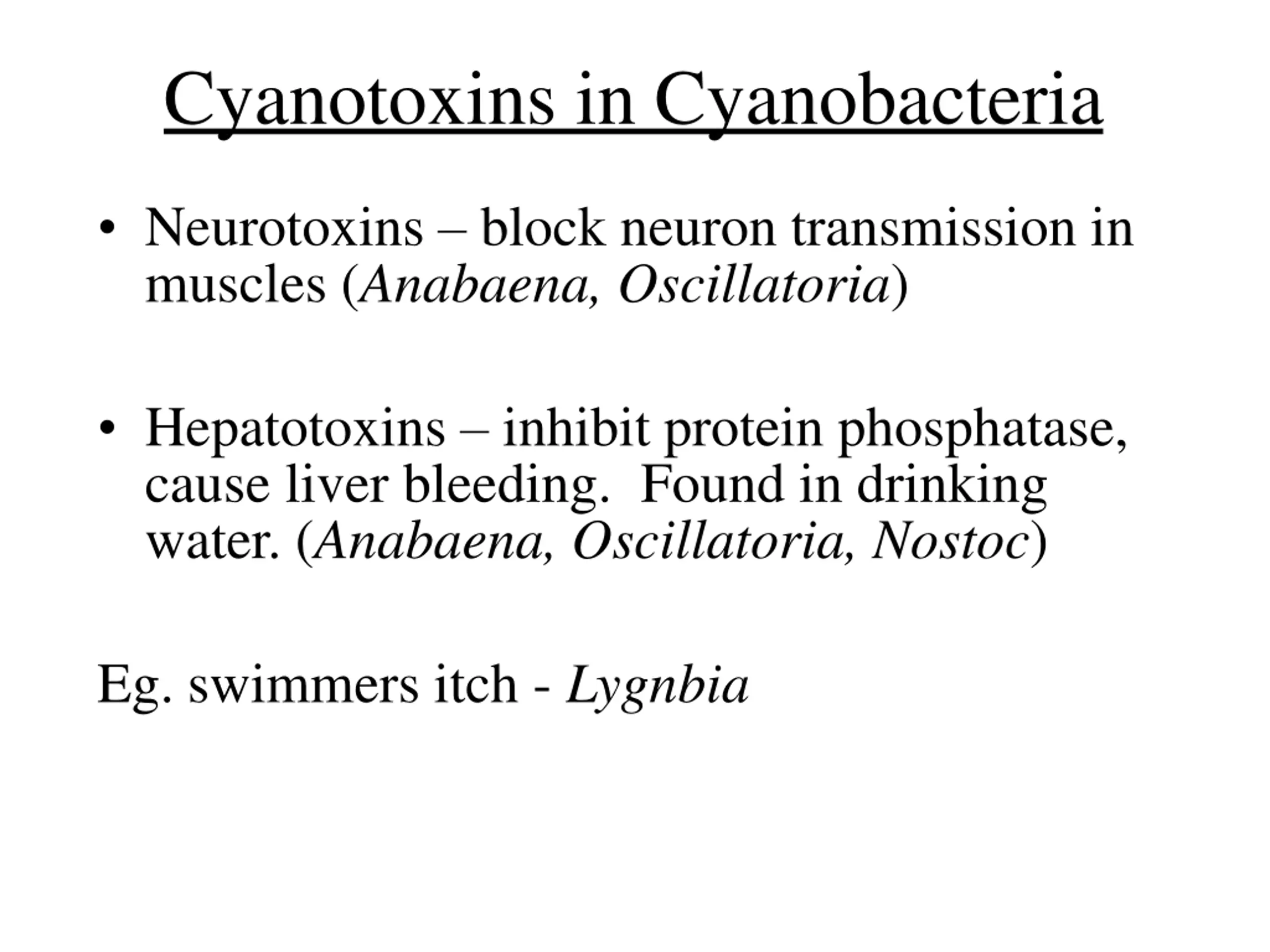 Cyanotoxins in Cyanobacteria Neurotoxins block neuron transmission in muscles (Anabaena, Oscillatoria) Hepatotoxins inhibit protein phosphatase, cause liver bleeding. Found in drinking water. (Anabaena, Oscillatoria, Nostoc) Eg. swimmers itch - Lygnbia