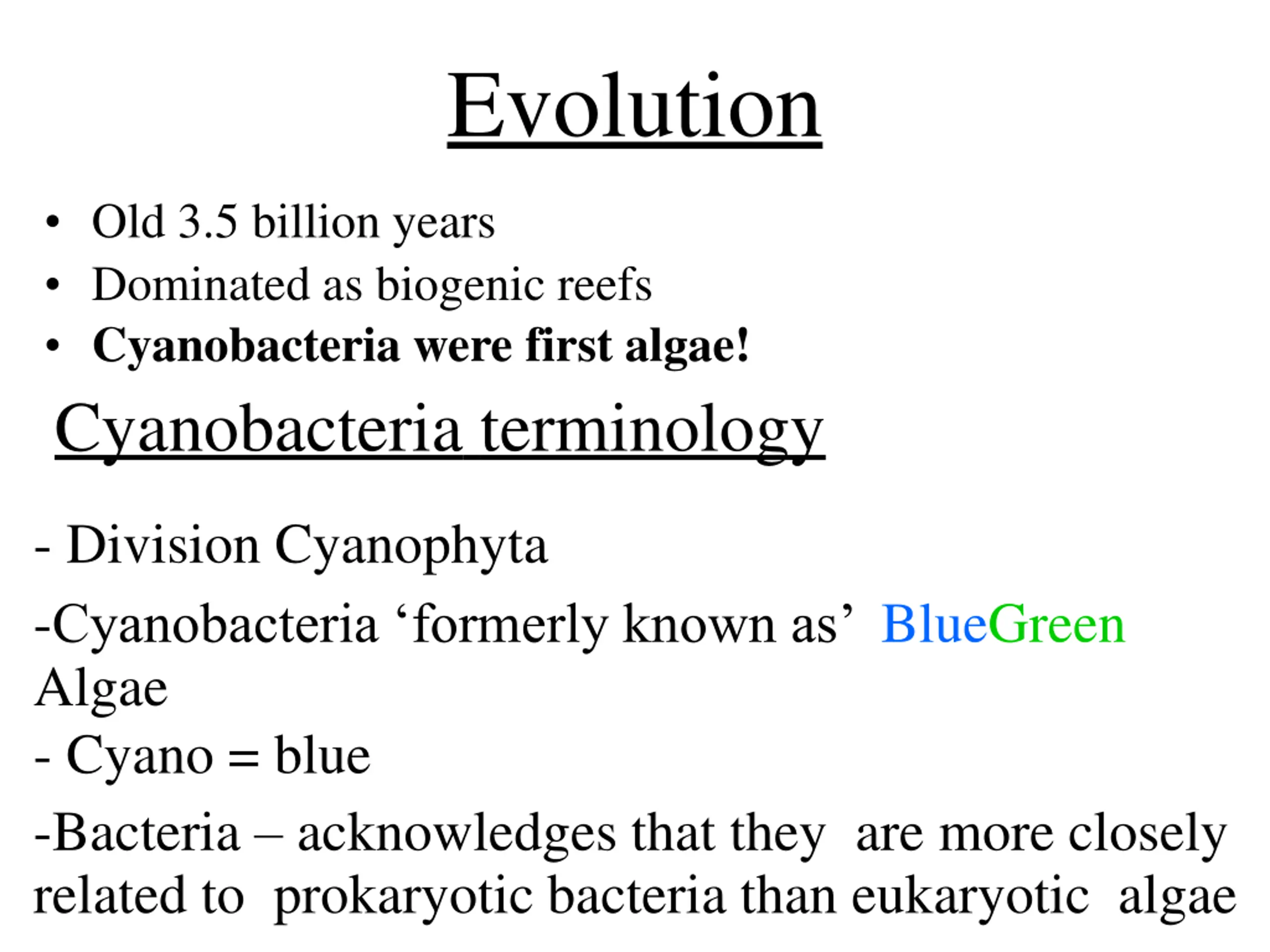 Evolution Old 3.5 billion years Dominated as biogenic reefs Cyanobacteria were first algae! Cyanobacteria terminology - Division Cyanophyta -Cyanobacteria formerly known as BlueGreen Algae - Cyano = blue -Bacteria acknowledges that they are more closely related to prokaryotic bacteria than eukaryotic algae
