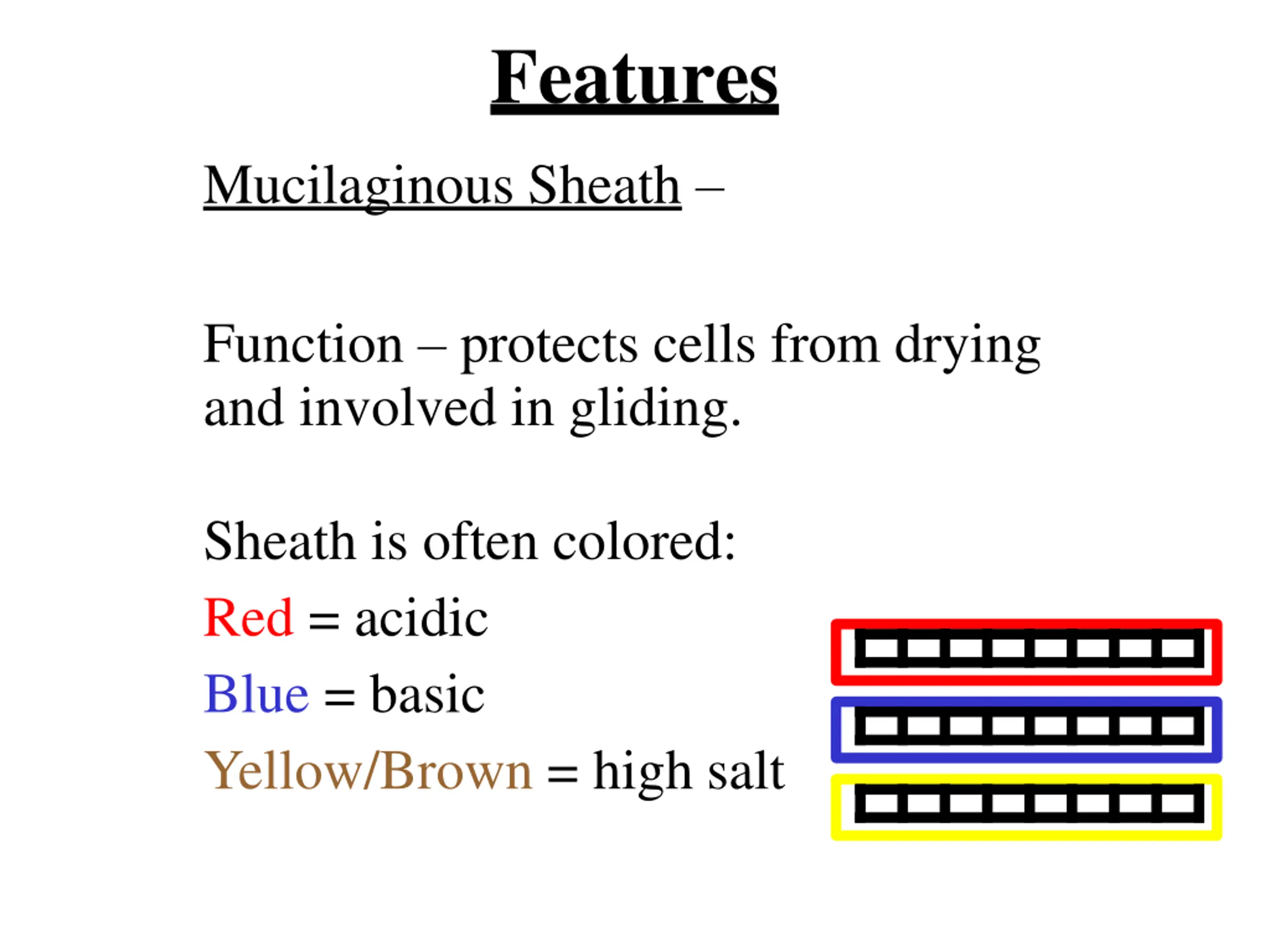 Features Mucilaginous Sheath Function protects cells from drying and involved in gliding. Sheath is often colored: Red = acidic Blue = basic Yellow/Brown = high salt