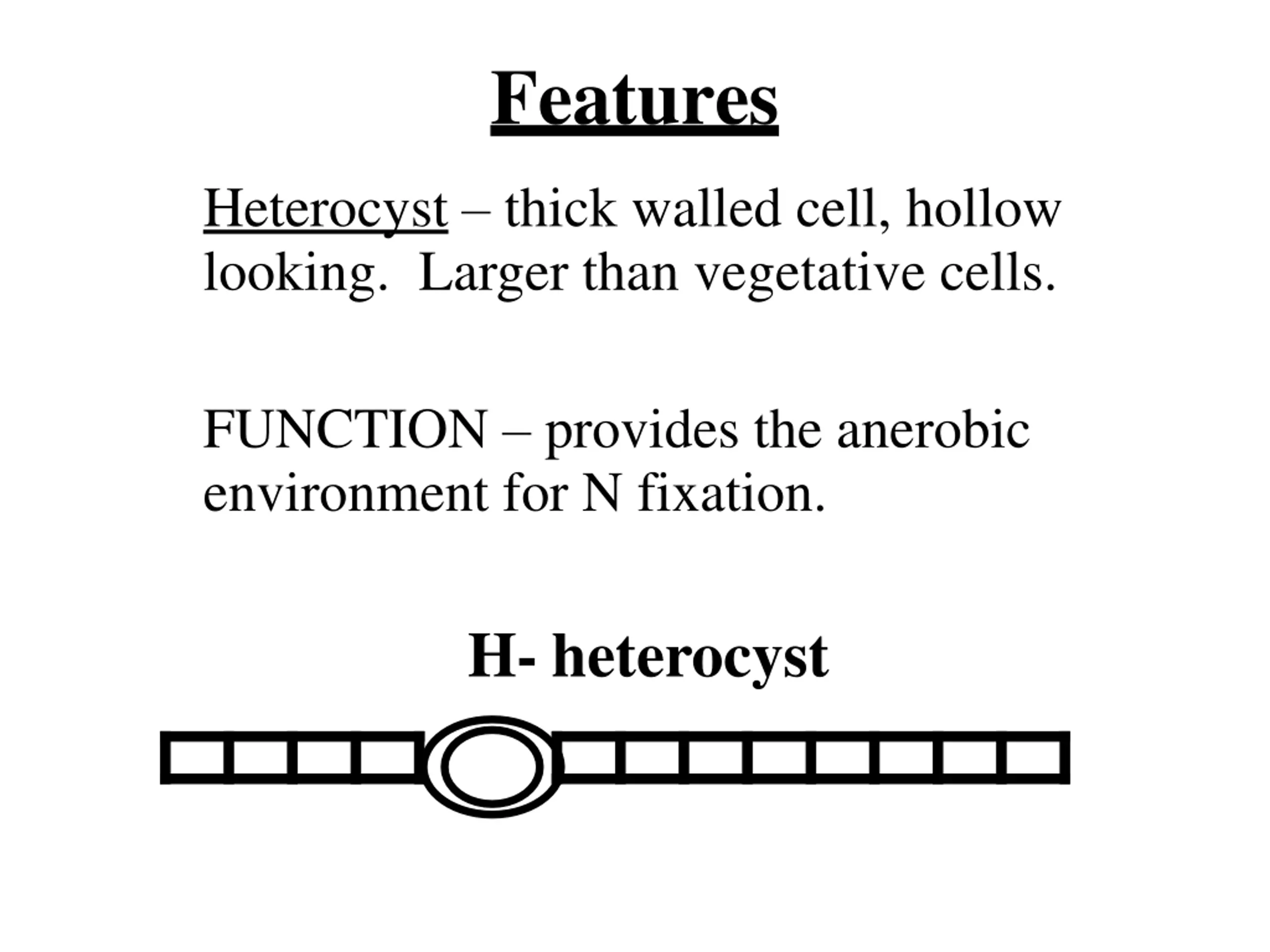 Features Heterocyst thick walled cell, hollow looking. Larger than vegetative cells. FUNCTION provides the anerobic environment for N fixation. H- heterocyst
